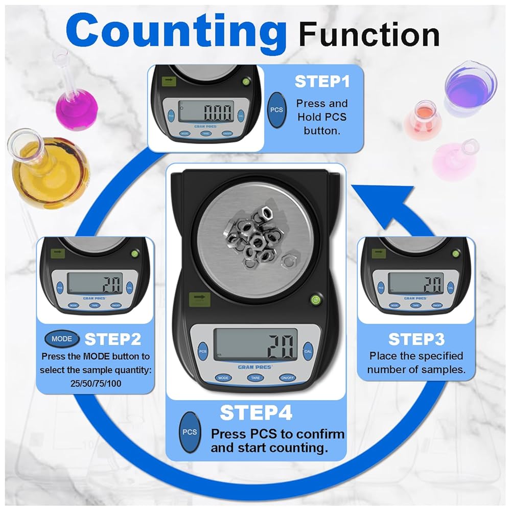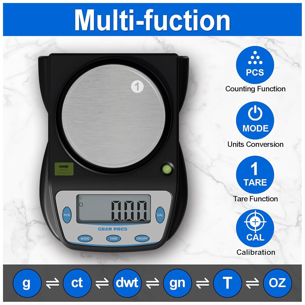 MULTI-FUNCTIONAL - Easily switch between six different units of measurement by pressing the MODE button. Available units include: gram (g), carat (ct), pennyweight (dwt), grain (gn), tola (T), and ounce (oz). This scale measures diverse items like jewelry, screws, and powders, making it ideal for labs, schools, industrial settings, and kitchens. Non-slip feet adapt it to various weighing environments.