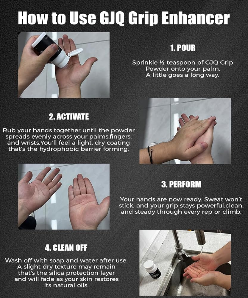 Revolutionary Hydrophobic Formula: Unlike regular or liquid chalk, GJQ uses a hydrophobic silica-based powder that forms a nano-level dry layer on your hands. It repels moisture instantly and keeps your grip clean and consistent even under heavy sweat.