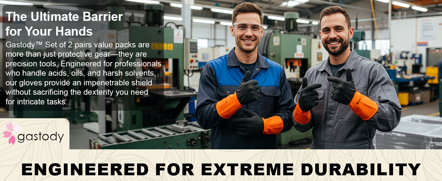 Top Protection for Your Hands: Gastody chemical gloves will offer the highest protection to your hands from solvents, paints, varnishes, stains, cleaners and oils and grease; These chemical gloves for men and women act like a shield against a range of chemicals, domestic and industrial.