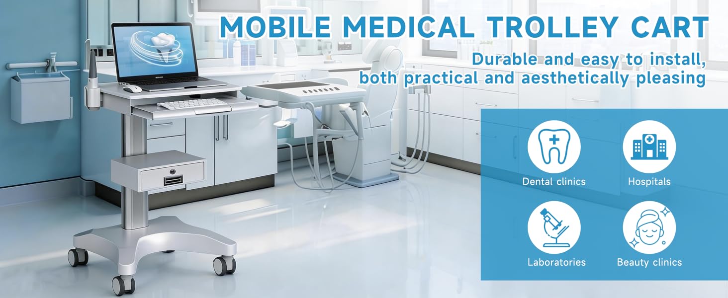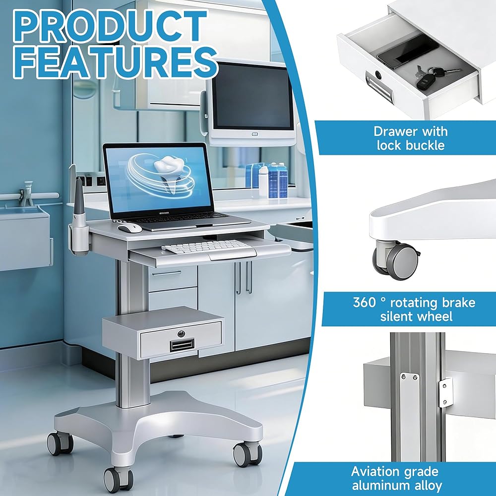 【360° Lockable Casters】This rolling dental scanner cart with wheels feature 4 swivel casters with foot brakes, ensuring smooth mobility and stable stationary placement for clinical spaces.