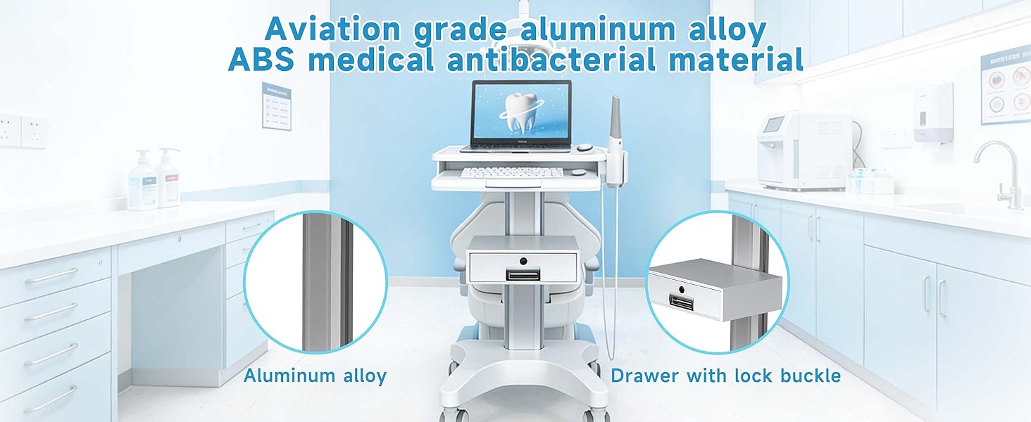 【Durable & Stable】The dental scanner cart is made of high-grade aluminum alloy, with anti-electromagnetic interference, scratch and corrosion resistance, protecting the cart and precision equipment for long-term use.