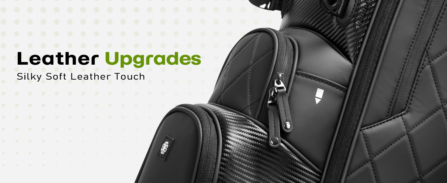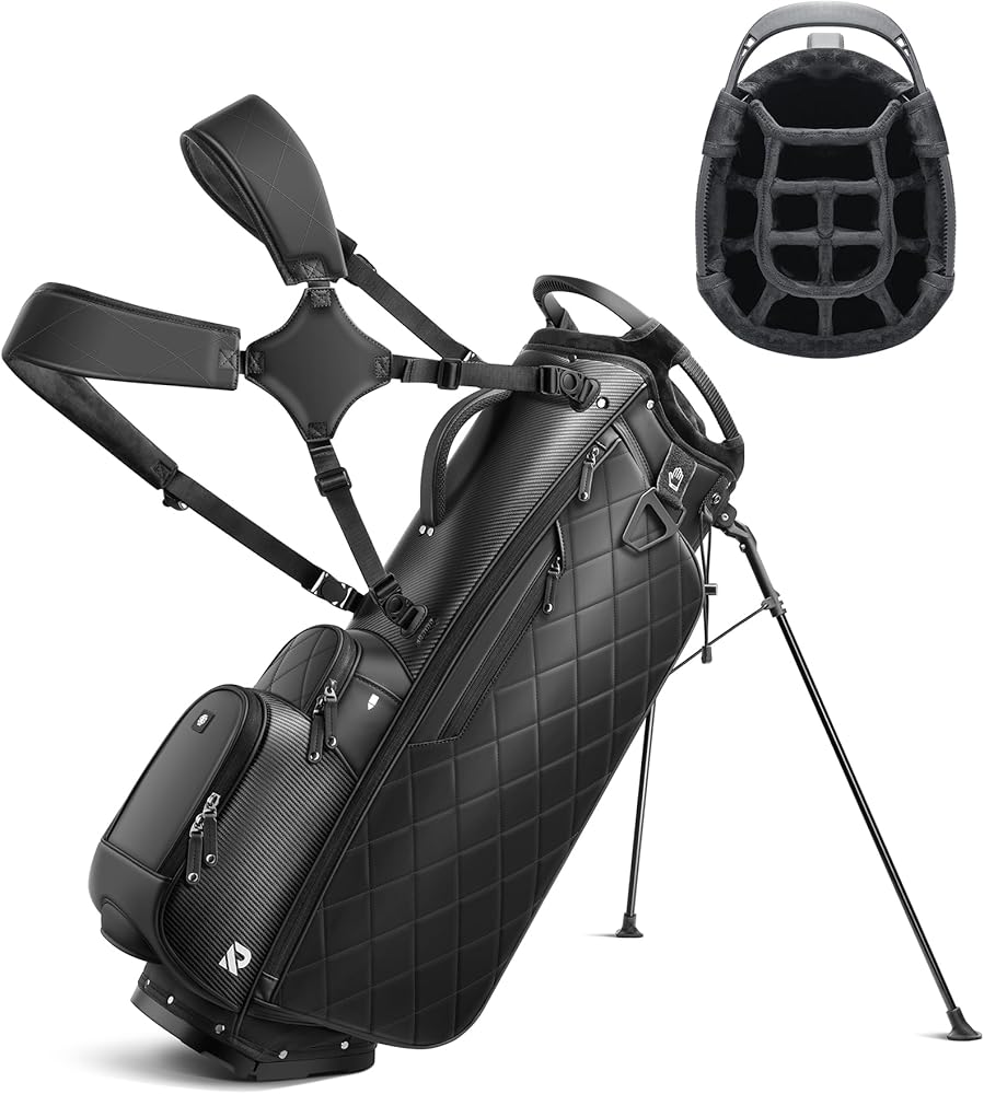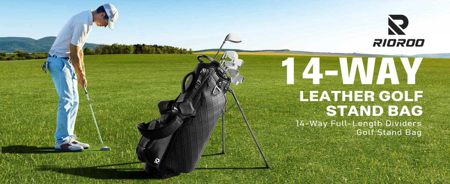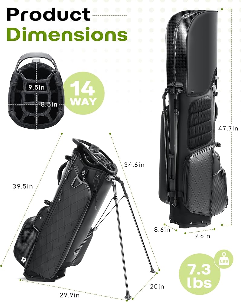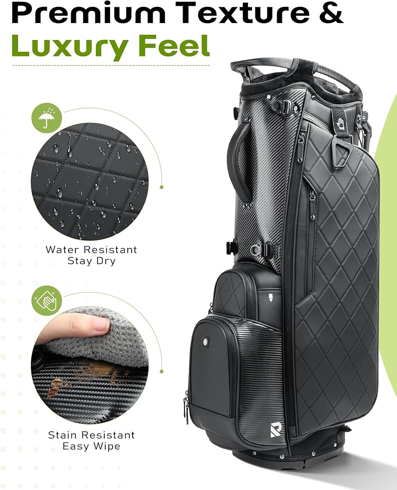 1. LEATHER CRAFT—RIOROO 14 way full-length divider leather golf bag boasts upgraded leather material, weighing 7.1 lbs and measuring 35in*13in*9in. Lightweight and sleek, it comes with a dedicated leather rain hood to shield your golf accessories from rain. The water-resistant leather exterior repels stains and is easy to wipe clean