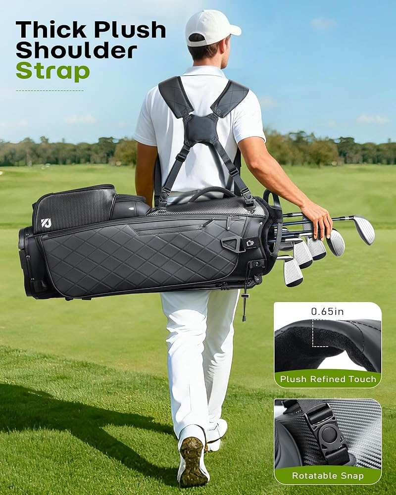 5. COMFORT STRAPS—This 14 way golf stand bag has detachable X-shaped soft padded velvet straps with premium high-elastic foam. The breathable mesh and extra thick padding evenly distribute bag weight, ease shoulder and back pressure, feel gentle against skin and stay secure—keeping you fully comfy on long course walks