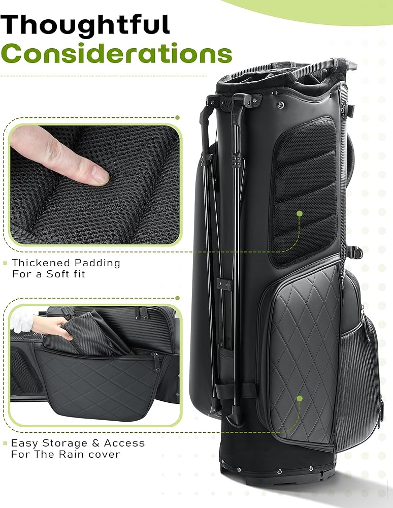 3. STABLE SUPPORT—This golf bag with stand has a reinforced triangular frame, non-slip foot pads, bend-resistant rods and elastic hinges. It stays firmly upright on fairways, slopes, bunker edges and other terrains without tipping. The golf bag stand opens smoothly with strong load-bearing capacity, keeping the bag upright