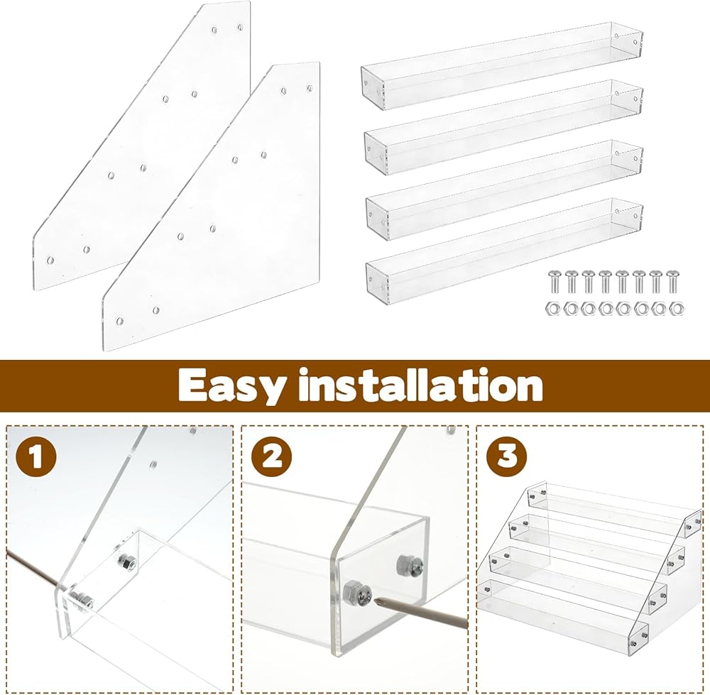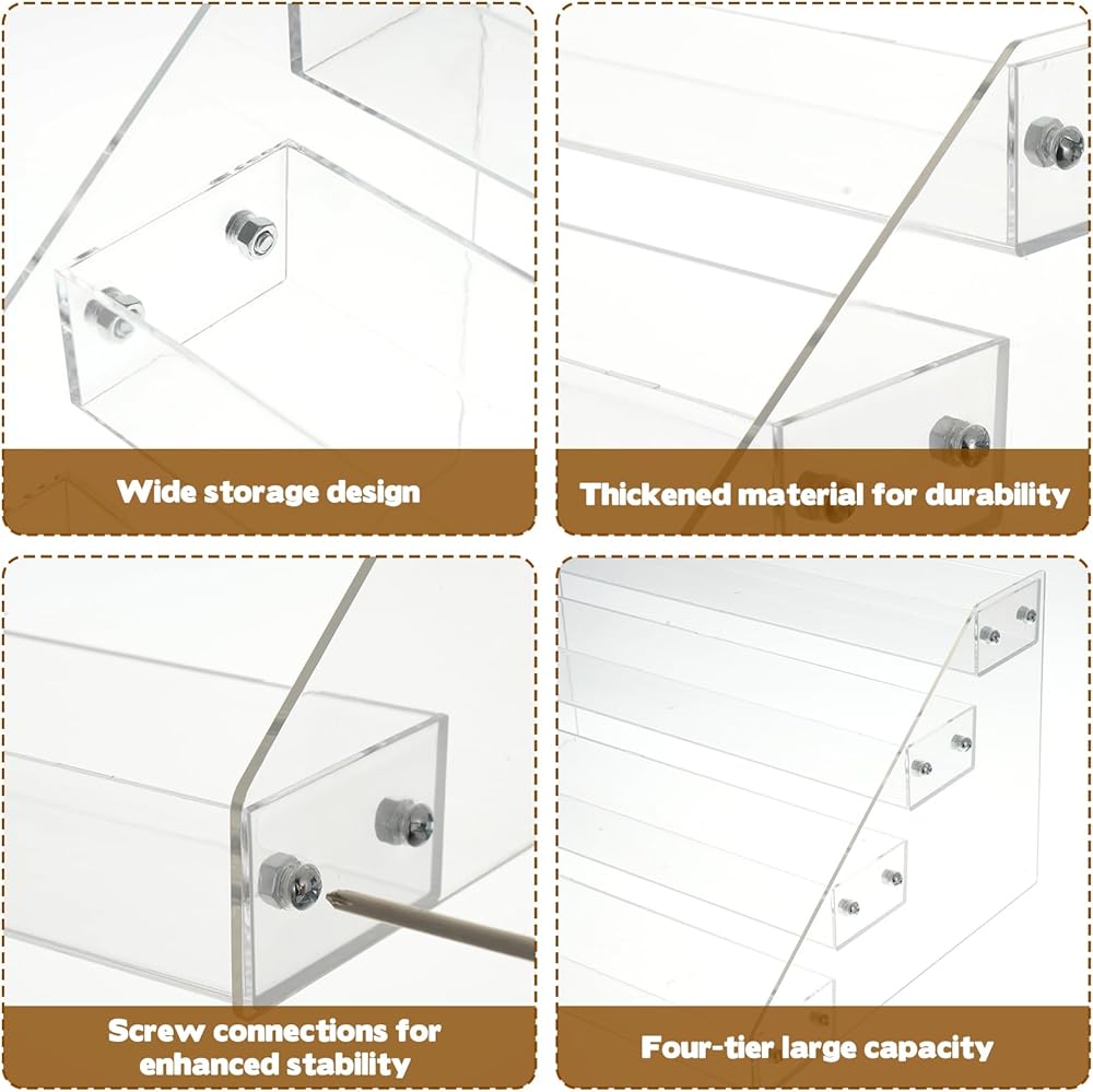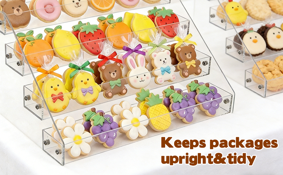 Versatile Display Stand Organizer: You will get 2 pack 4-tier acrylic clear cookie display stand offers an elegant way to showcase your cookies, cupcakes, donuts, muffins, breads and pastries, spices, figures, trading cards and acrylic sticker. This multi-functional display rack is also ideal for bakeries, allowing customers to easily see what they're looking for and effectively boosting sales at farmers' markets, craft fairs, and bakeries. It keeps things neat and organized