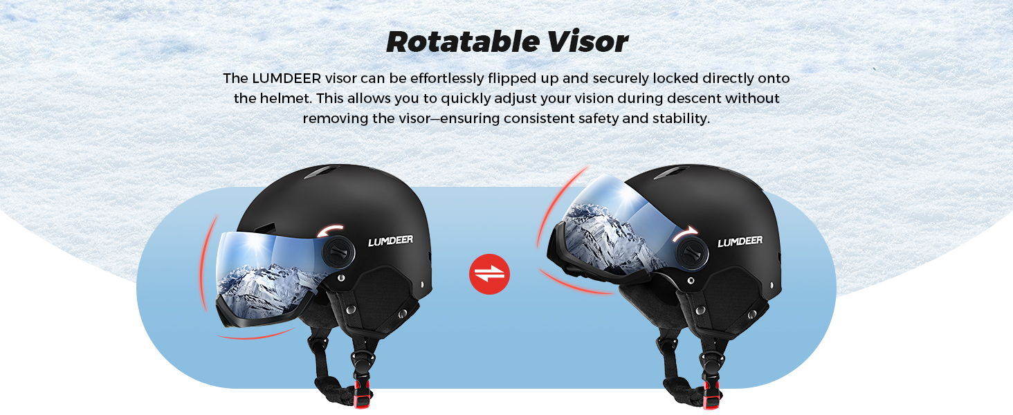 [Integrated Ski Goggles]: Designed for seamless one-hand operation, the built-in goggles eliminate the risk of detachment during vigorous movement, enhancing helmet stability and allowing you to ski or snowboard with complete confidence and peace of mind.