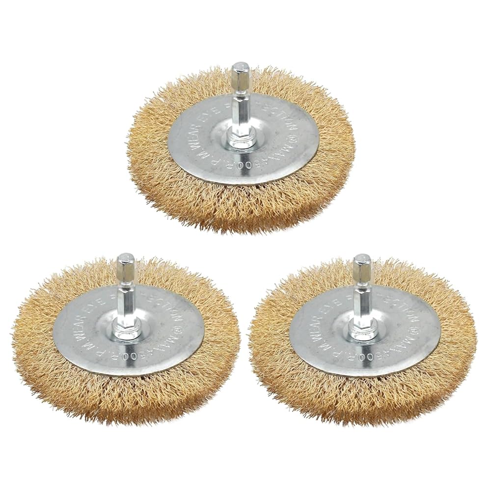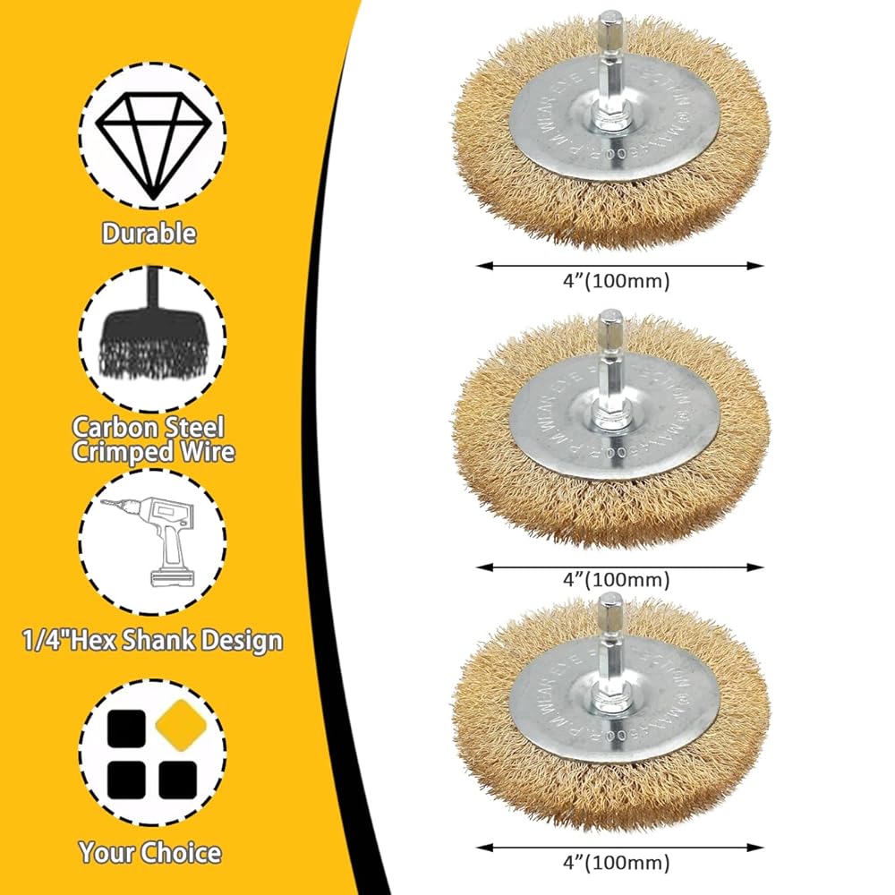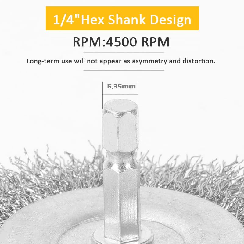 3 Pack Wire Brush Set: This package includes: 3 pcs 4"(100mm) brass coated brush with 1/4 inch hex shank. Hardened steel wire long maximum 4500 RPM. The wire wheel for drill kit is much cost-efficient than buying from a local tool store