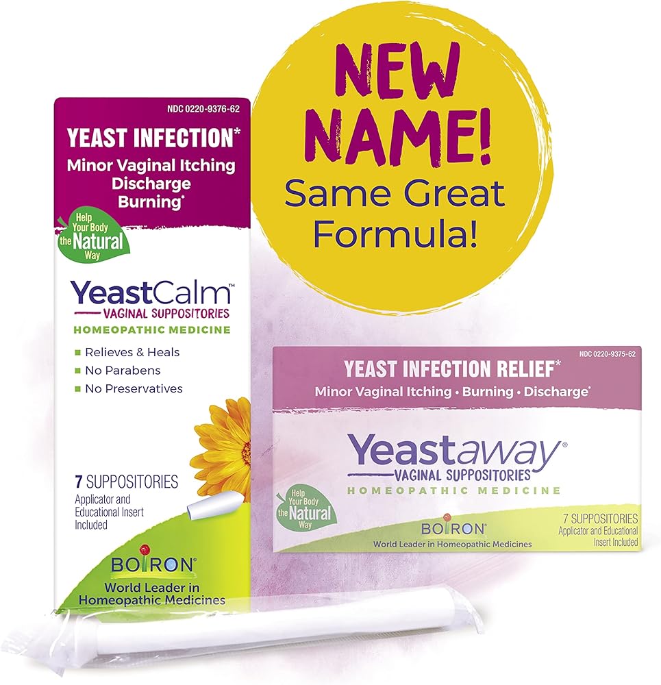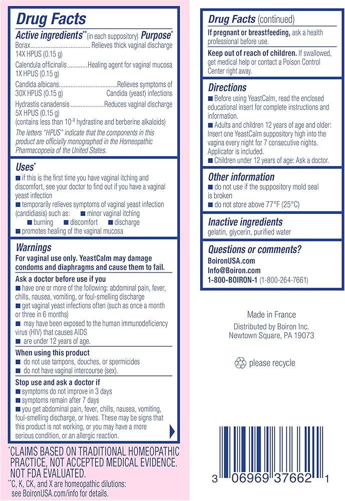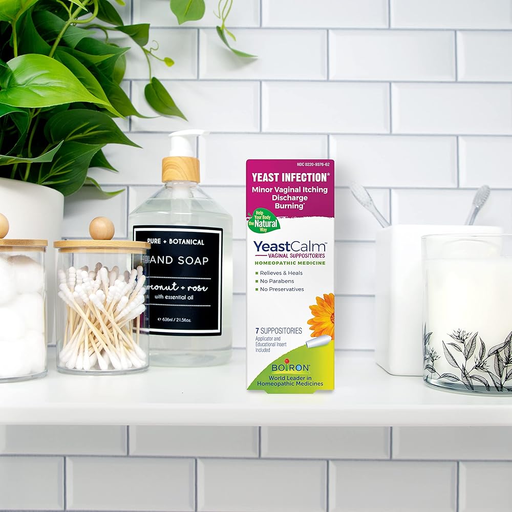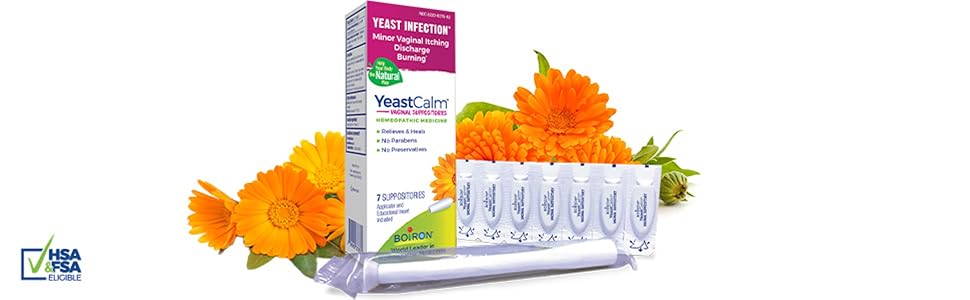If you suffer from yeast infections, it's time to get relief. YeastCalm by Boiron calms the discomfort of minor vaginal itching and burning from yeast infections with plant-based and other pure active ingredients. * Plus, it's powered by borax and Calendula to heal delicate vaginal tissue. * These once-daily overnight suppositories conveniently deliver treatment directly to the affected area for continued improvement throughout the night. As a homeopathic suppository, YeastCalm offers a comfortable and practical solution that's free of parabens and preservatives. The pre-measured quantity of medicine is simple and easy to use at the first sign of symptoms before discomfort becomes more disruptive. (See a doctor for first-time diagnosis of a yeast infection. ) Recommended for adults and children ages 12 and up, YeastCalm is an HSA & FSA eligible over-the-counter medicine. Each box contains 7 vaginal suppositories along with an easy-to-use applicator and educational insert. The Boiron personal care line includes Cyclease® Cramps, Cyclease PMS Relief, and Cyclease Menopause. *Claims based on traditional homeopathic practice, not accepted medical evidence. Not FDA evaluated.