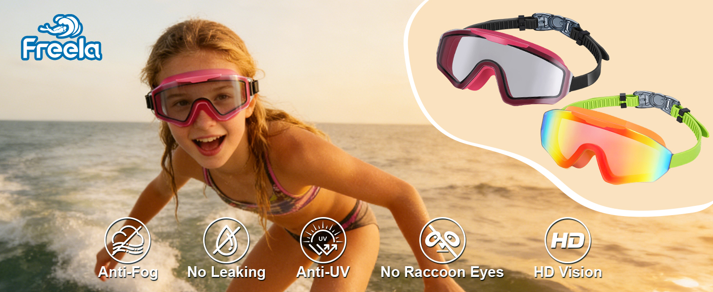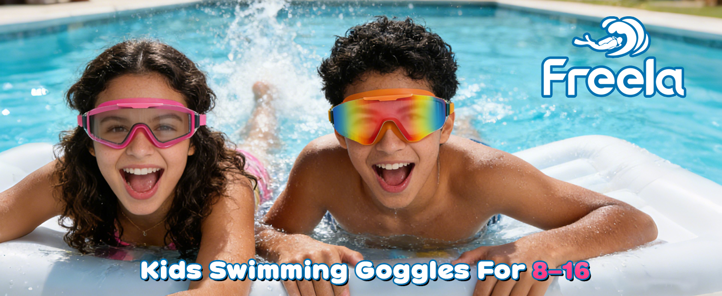 【Frameless&Panoramic 180°Clarity】 Freela kids swim goggles with the advanced frameless construction maximize the field of vision, providing an immersive, ultra-wide 180° underwater view. Made with impact-resistant polycarbonate, the lenses ensure crystal-clear sightlines, allowing 8-16 boys and girls to swimming in the pools and observe their surroundings with confidence and safety.