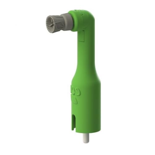 Slim green prophy angle with ribbed cup 1000/pk made with 25% less plastic. Textured eco leaf grip design. Exterior-ribbed cup designed for reduced splatter. Slim neck diameter. Compact ergonomic prophy angle body. Create a greener dental environment with the new eco-friendly slim disposable prophy angle from Denticator. Box of 1000 prophy angles with cups.