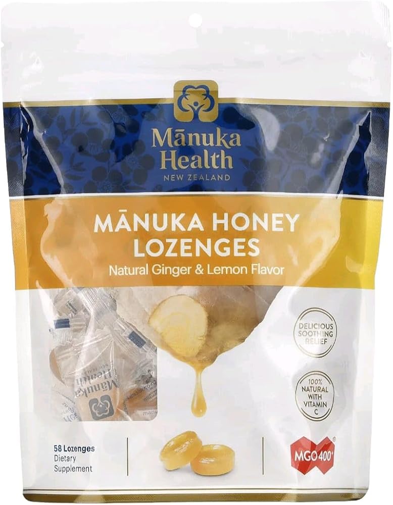 Manuka Health Manuka Honey Cough Drops – 58 Natural Lemon & Ginger Flavored Throat Lozenges Infused with Raw Manuka Honey and Vitamin C for Immune Support