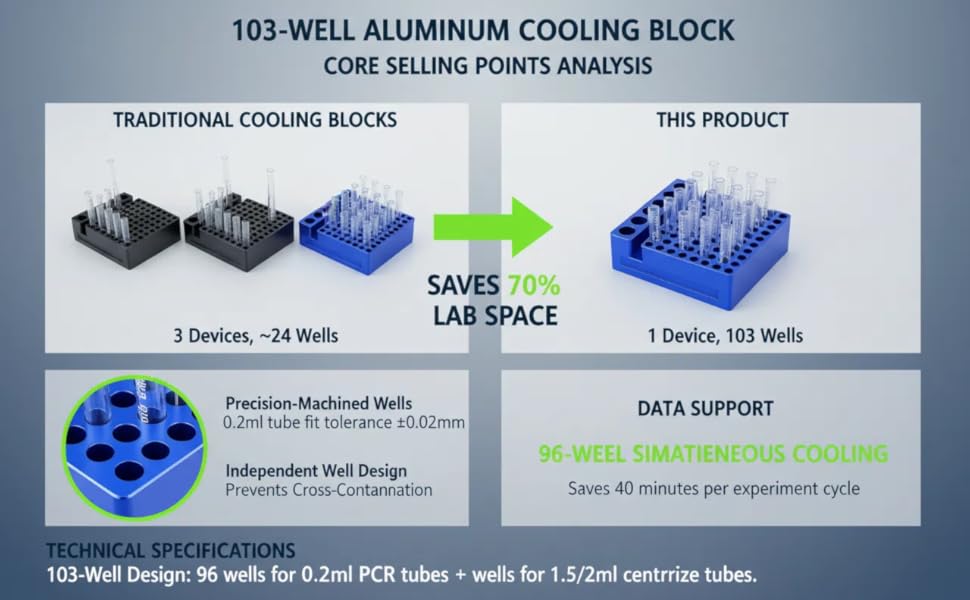 103-WELL DESIGN: This aluminum cooling block features 103 wells, including 96 wells specifically designed to fit 0.2ml PCR tubes and 7 larger wells for 1.5/2ml centrifuge tubes, offering versatility for various lab applications.