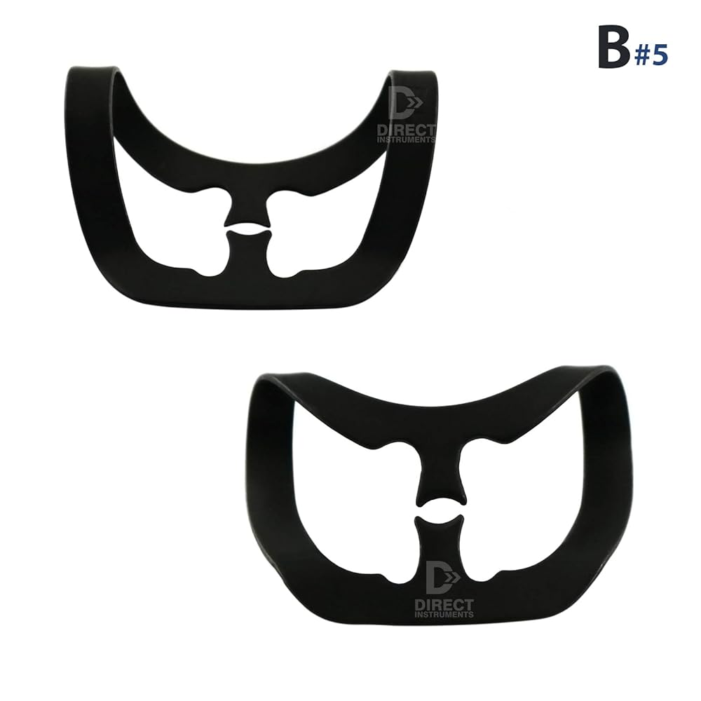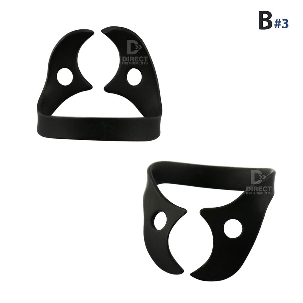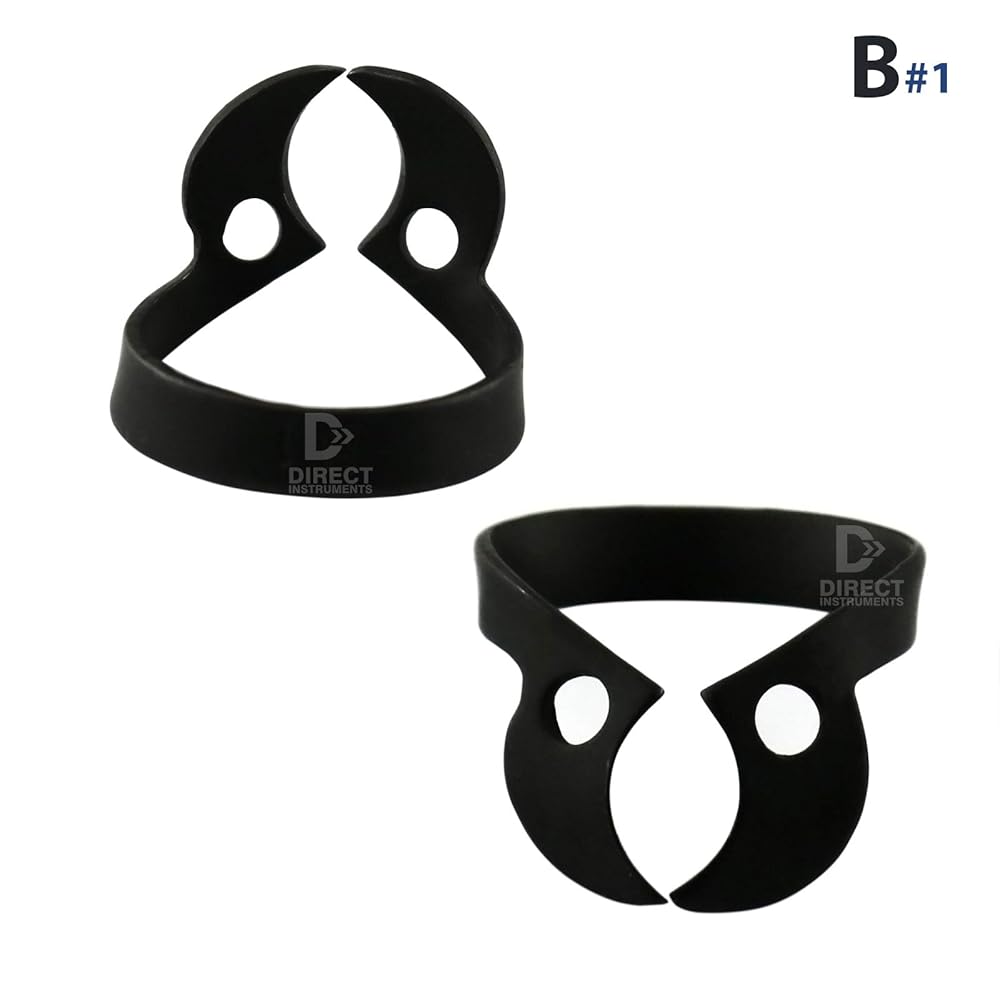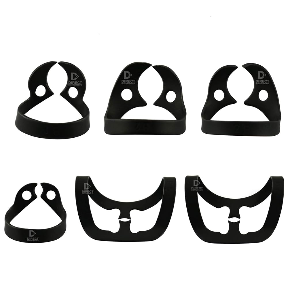 Direct Instruments Set Of 6 Black Color Coated Dental Rubber Dam Brinker Clamps. #B1 - Lower Molars #B2 - Upper Left Molars #B3 - Upper Right Molars #B4 - Anterior & Canines, Bicuspids #B5 - All Bicuspids & Incisors #B6 - Class V Restorations On All Teeth
