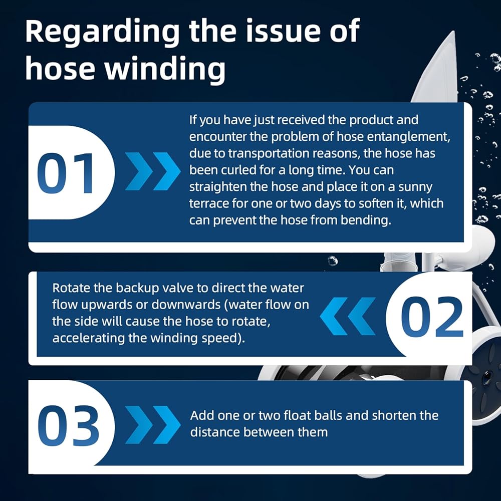 Solving Hose Tangling: 1) For new arrivals, if the hose is coiled from shipping, simply straighten it and leave it on a sunny patio for 1-2 days. This allows the hose to soften and relax, preventing persistent curls. 2) Rotate the backup valve so the water flow points upward or downward, as side-facing jets can cause the hose to spin and tangle faster. 3) Add one or two extra float balls and shorten the distance between them for better hose management.