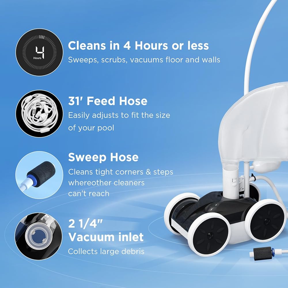 Upgrade & Improvement: The hose and machine components are crafted from high-quality plastics, rigorously refined and upgraded for long-lasting durability and reliable performance. (Please Note: The booster pump and pool water inlet MUST be equipped with a 1.5-inch female thread for connection and must provide 4 Bar water pressure. If you receive a product with quality issues or any missing parts, please contact us via Amazon for a replacement.)