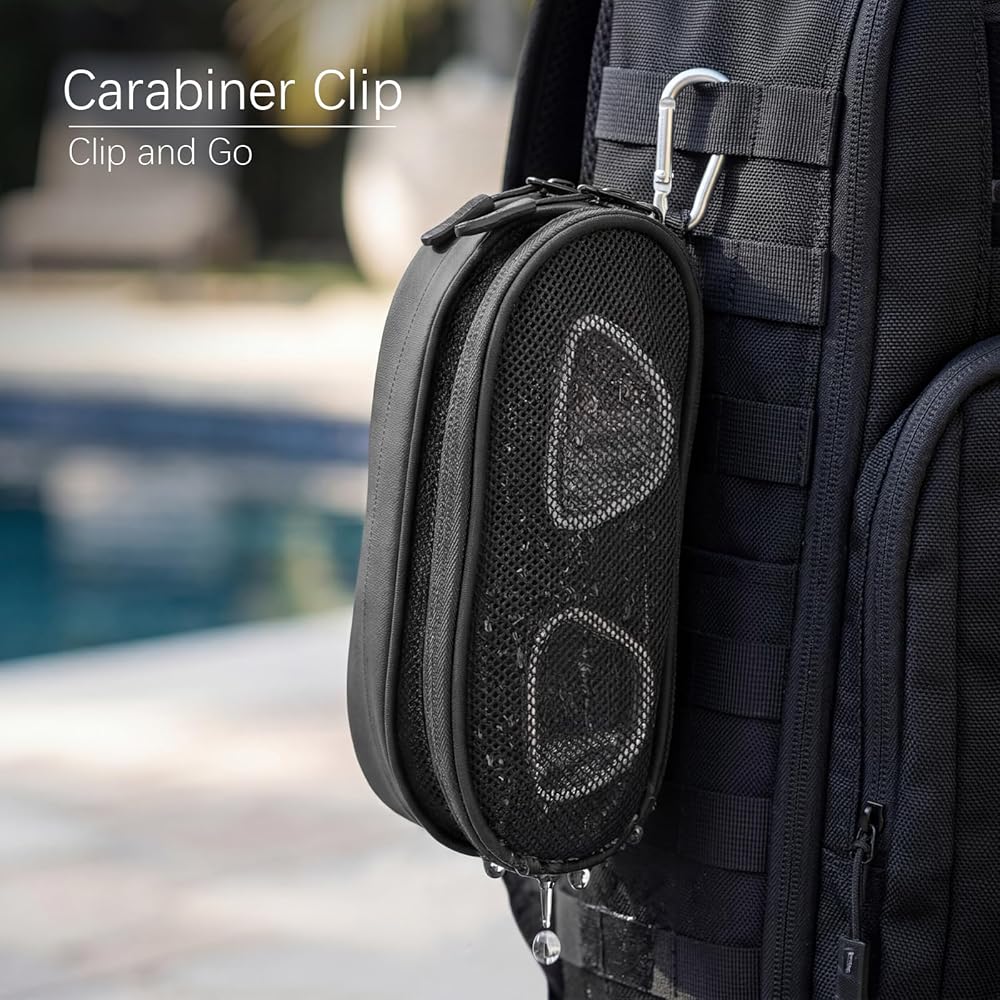 • CLIP AND GO: A built-in carabiner makes it easy to hang the case on a backpack, mesh gear bag, or locker hook. Grab your goggles faster on the way to practice, workouts, lessons, or swim meets without digging through a crowded bag.