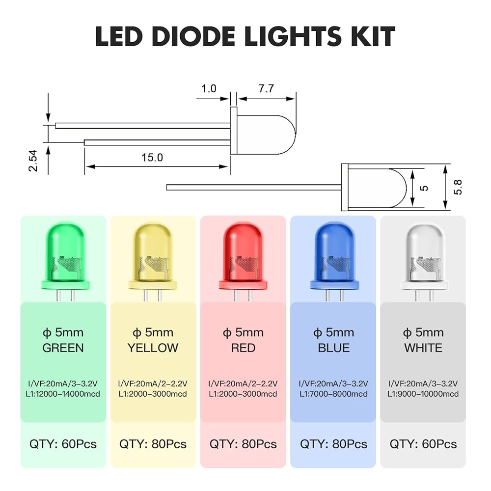 【Include】LED Diode Light Assortment Kit contains 360pcs of 5mm LED diodes in 5 colors (Red, Yellow, Green, Blue, and White). The humanized packaging is easy storage and use