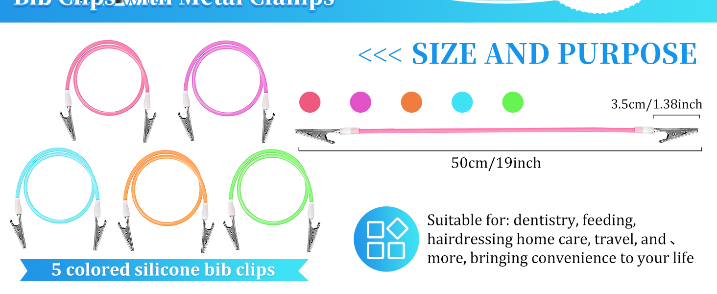 VIBRANT MULTICOLOR 5-PACK: This set includes five brightly colored silicone bib clips in pink, purple, green, blue, and orange. Whether in a clinic, classroom, or home, the cheerful colors add a fun and practical touch to your setup.