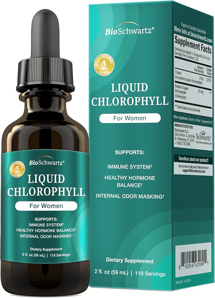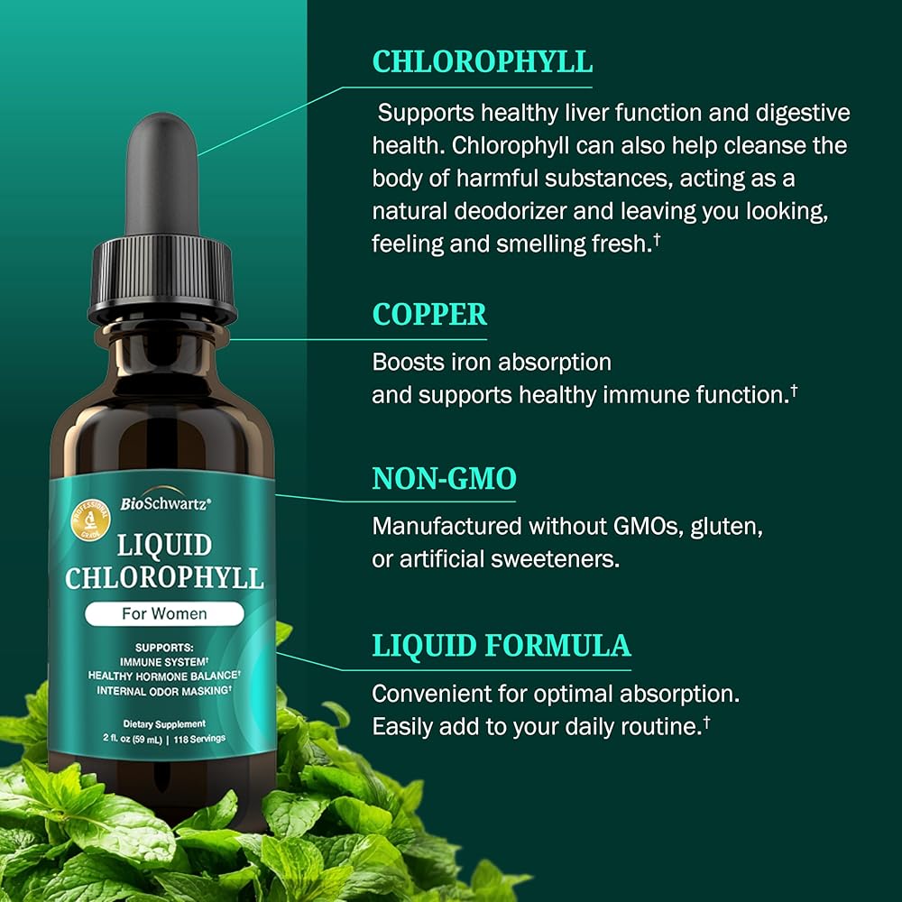 BioSchwartz Liquid Chlorophyll for Women - with Copper for Immune Support, Skin Health and Internal Deodorizer - Liquid Chlorophyll Supplement Drops for Women - Third Party Tested, 118 Servings