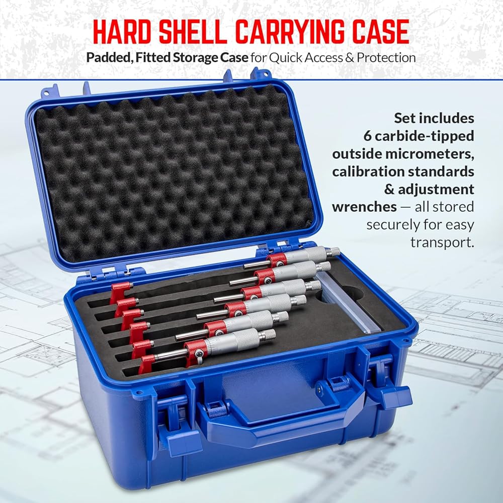 Premium Outside Micrometer Set 0-6" / 0.0001" Set includes a 4 carbide tip outside micrometers, calibration standards, and adjusting wrenches packaged neatly in a padded hard shell case. Every order you will receive a set of 0-1" / 1-2" / 2-3" / 3-4" /4-5" / 5-6" outside micrometers with microfine Graduations: 0.0001" and Accuracy: ±0.0001" for precise readings every time. The red textured design and satin chrome thimble helps resist rust, reduce glare and are easily identifiable in your shop. Each micrometer has a metal ratchet-stop thimble with a speeder knob to reduce the time it takes to open and close the micrometer. To Prevent over tightening the constant-force mechanism stops the micrometer's spindle from tightening once it contacts the surface of the measured object.
