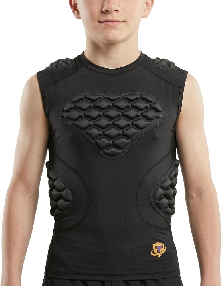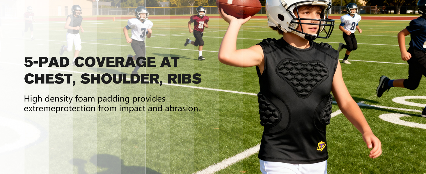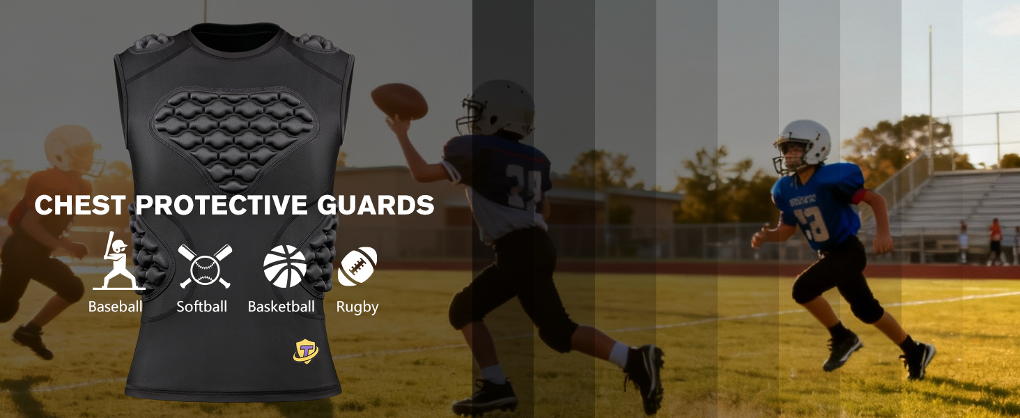 This youth football undershirt allows kids to enjoy being active without feeling bulky or restricting the movement. Fits for American Football, Rugby, Hockey, Lacrosse, T ball, Goalie and more.This kids 5 pads padded compression shirt protects your sternum, heart chest, ribs and shoulder