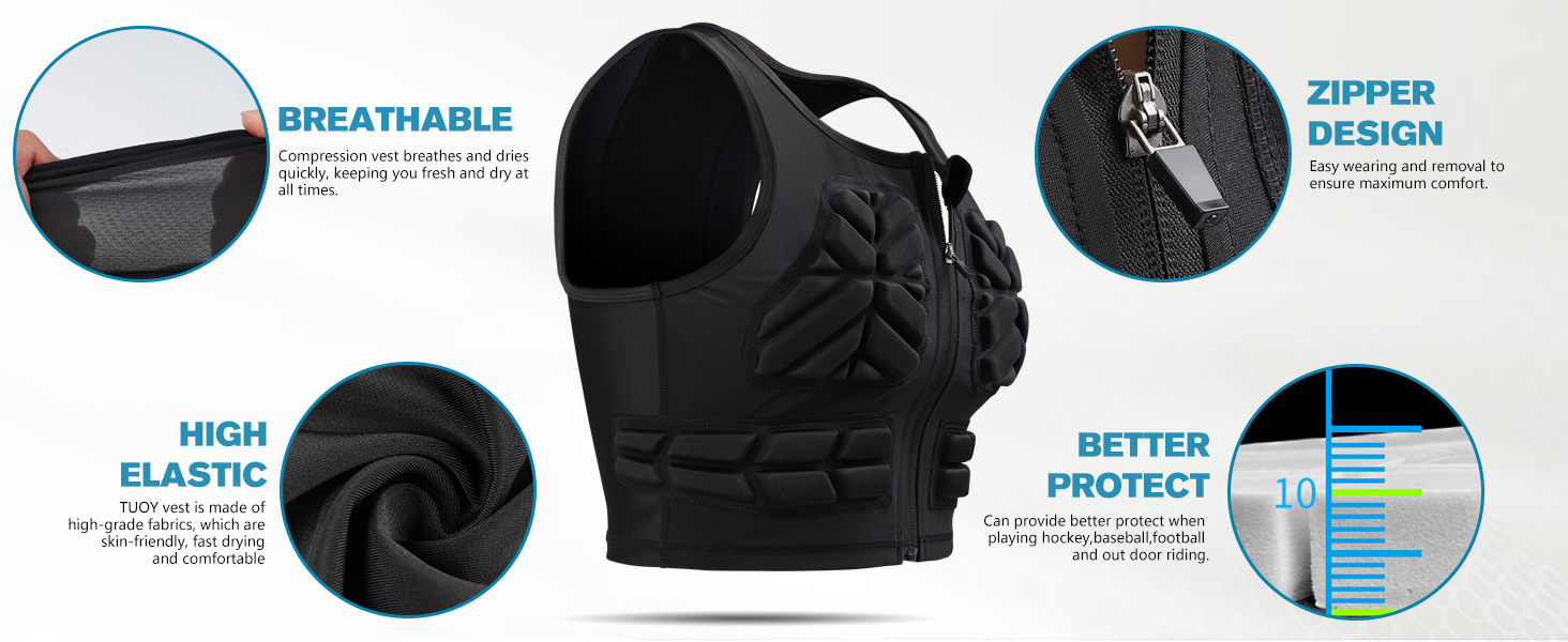 High-density EVA foam padding protection during sports. The integrated Pad vest protects your sternum, heart chest, breast, and rib. Protect chest area from sudden impacts and slight injuries from balls, pitches, and hard hits.