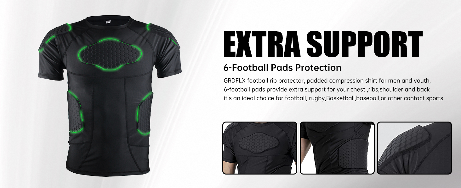 Impact Protection with Extended Coverage:GRDFLX football padded shirt,padded compression shirt for men and youth, 6-football pads better wrapping and coverage on your shoulders and ribs. Padded shirt it is suitable for football, rugby, and as a baseball catcher's chest protector. Honeycomb special padding design for protection