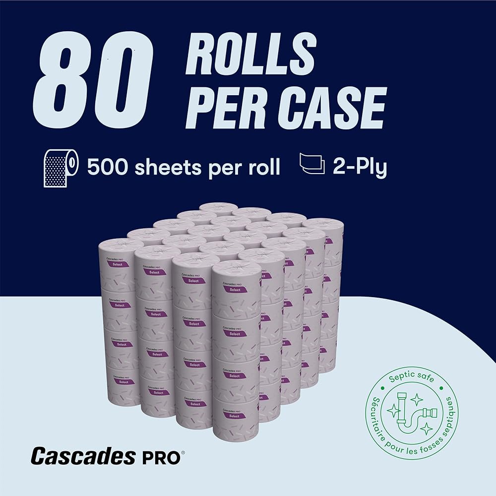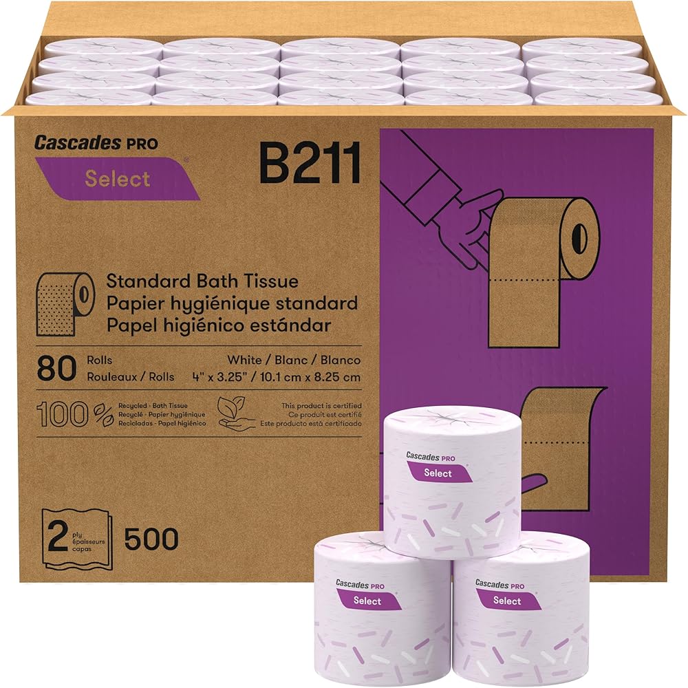 Cascades PRO Select B211 Standard Bath Tissue delivers comfort, durability, and sustainability in a cost-effective format designed for high-traffic restrooms. Each 2-ply roll contains 500 sheets, offering softness with reliable strength for everyday use. These rolls are universally compatible with most standard bathroom tissue dispensers and are individually wrapped for hygienic storage and handling. Manufactured from 100% recycled fiber with at least 50% post-consumer content, this tissue is Green Seal certified and safe for plumbing and septic systems. With 80 rolls per pack, Cascades PRO Select B211 provides an economical and environmentally responsible solution for schools, offices, foodservice, and retail spaces.