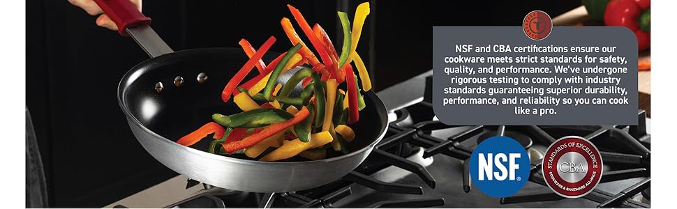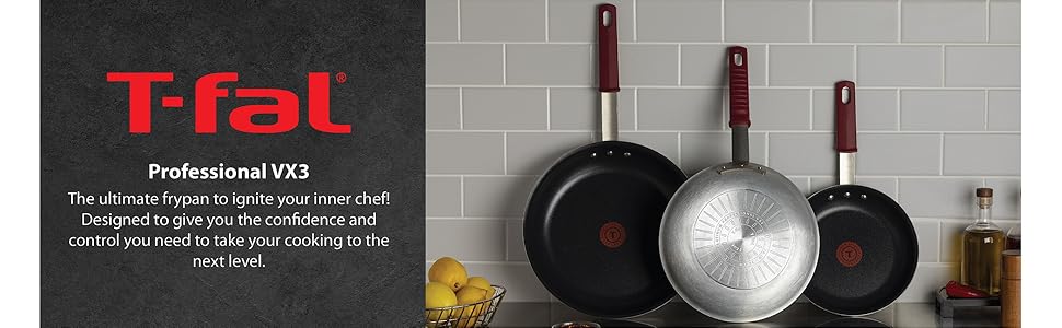 Cook like a pro with T-fal Professional VX3 Non-Stick Cookware. These exceptional pan is crafted with an NSF and CBA certified body, engineered for outstanding durability and versatility. Whether you're preparing hamburgers, pork chops, or pancakess, this 12 inch frypan is built to handle it all with ease. Made with a 100% recycled aluminum body (72% of total product is made out of recycled material) this cookware will help you reduce your eco-impact while creating delicious meals. This non stick fry pan features T-fal Platinum Non-Stick coating, our best coating, which is 10x more resistant than our basic coatings, providing superior performance and making cleanup a breeze. Includes our innovative Thermo-Spot® Technology, our unique heat indicator that turns solid red when pans are perfectly preheated to start cooking. The even heat base ensures quick, even heating and prevents hot spots, delivering consistent results every time, and making it compatible with all cooktops except induction. This cookware also features a triple-riveted, extra-long stainless-steel handle with a removable silicone sleeve for a secure, non-slip grip, making maneuvering safe and easy. Versatile enough to be oven-safe up to 400°F (500°F without the silicone sleeve), allowing you to effortlessly transition from stovetop to oven. T-fal Professional VX3 Non-Stick cookware is designed for the everyday cook who wants to elevate their kitchen experience with reliable, high-performance cookware. Whether you're a seasoned chef or a home cook, this cookware series is your key to achieving exceptional results with ease.