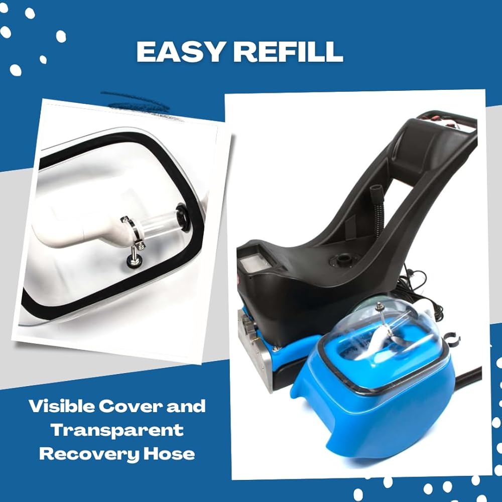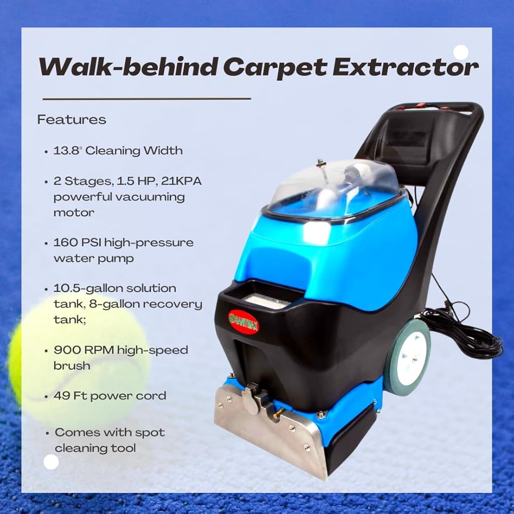 The SANITMAX Commercial Walk-Behind Carpet Extractor is built for routine carpet cleaning in hotels, offices, schools, and other high-traffic commercial spaces. With 160 PSI spray pressure, 21 KPA suction, a 13.8-inch brush width, and an 18.5-inch squeegee width, it is designed to scrub carpet effectively and recover dirty water for cleaner results. Its 10.5-gallon solution tank and 8-gallon recovery tank support longer cleaning sessions with fewer interruptions, making it a practical fit for larger carpeted areas. The included spot tool and hose also help clean stairs, upholstery, corners, and other detailed areas without needing a separate machine. This machine is best positioned as a commercial cold water carpet extractor, not a steam cleaner, for buyers who want a combination of strong spray pressure, strong suction, commercial tank capacity, and detail-cleaning flexibility. FQA Q: What is this machine used for? A: It is a commercial walk-behind carpet extractor for hotels, offices, schools, and other high-traffic carpeted areas. Q: Is this a steam cleaner? A: No. The title identifies it as a 160 PSI cold water carpet cleaner. Q: Does it include a tool for stairs or upholstery? A: Yes. It comes with a spot cleaning tool and hose for stairs, upholstery, corners, and hard-to-reach areas. Q: What are the tank sizes? A: It has a 10.5-gallon solution tank and 8-gallon recovery tank. Q: What kind of spaces is it best for? A: It is best for large carpeted commercial areas such as hotels, offices, schools, and other high-traffic spaces.