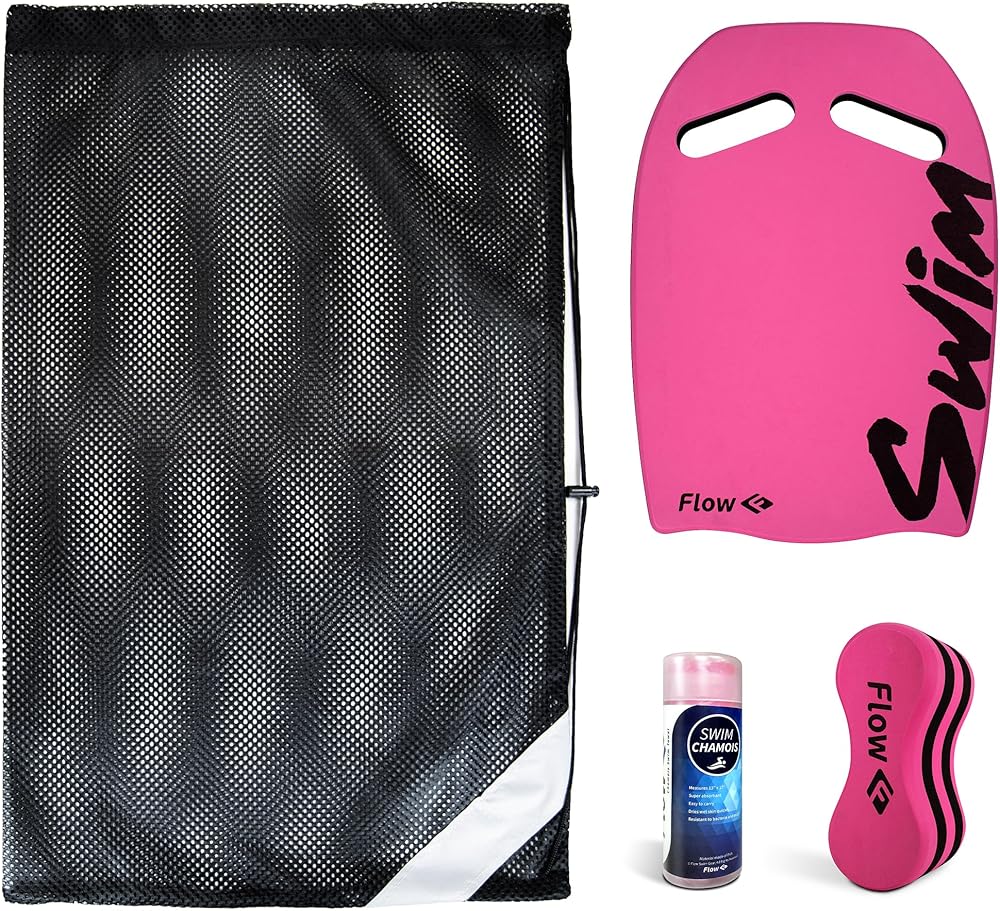 ALL-IN-ONE SWIM TRAINING SET: Includes a kids kickboard, junior pull buoy, swim chamois towel, and mesh gear bag.
