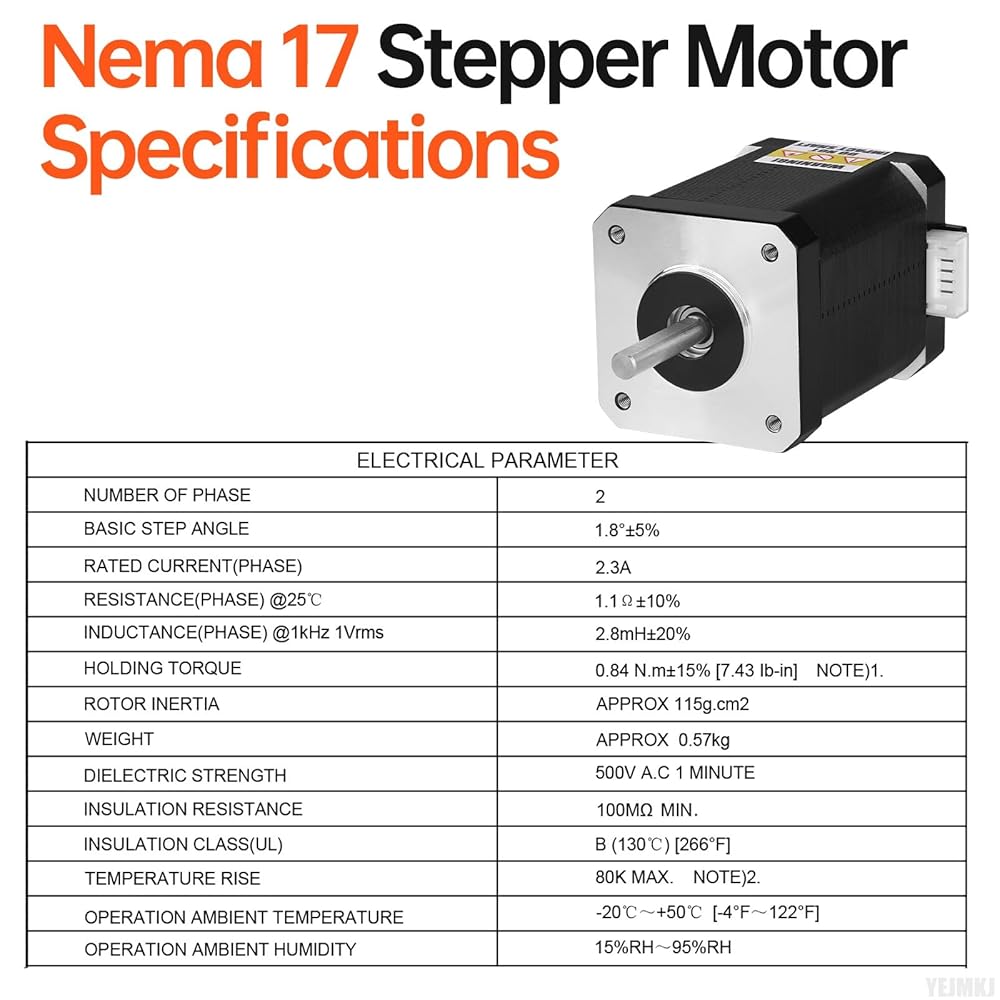 Parameters: Nema 17 Stepper Motor 2 Phase, Step angle 1.8 Degree (200 steps/rev), Holding torque 0.84Nm (118.95oz·in), Resistance 1.1Ω, Rated current 2.3A, Inductance 2.8mH±20%, Rotor inertia approx 115g.cm².