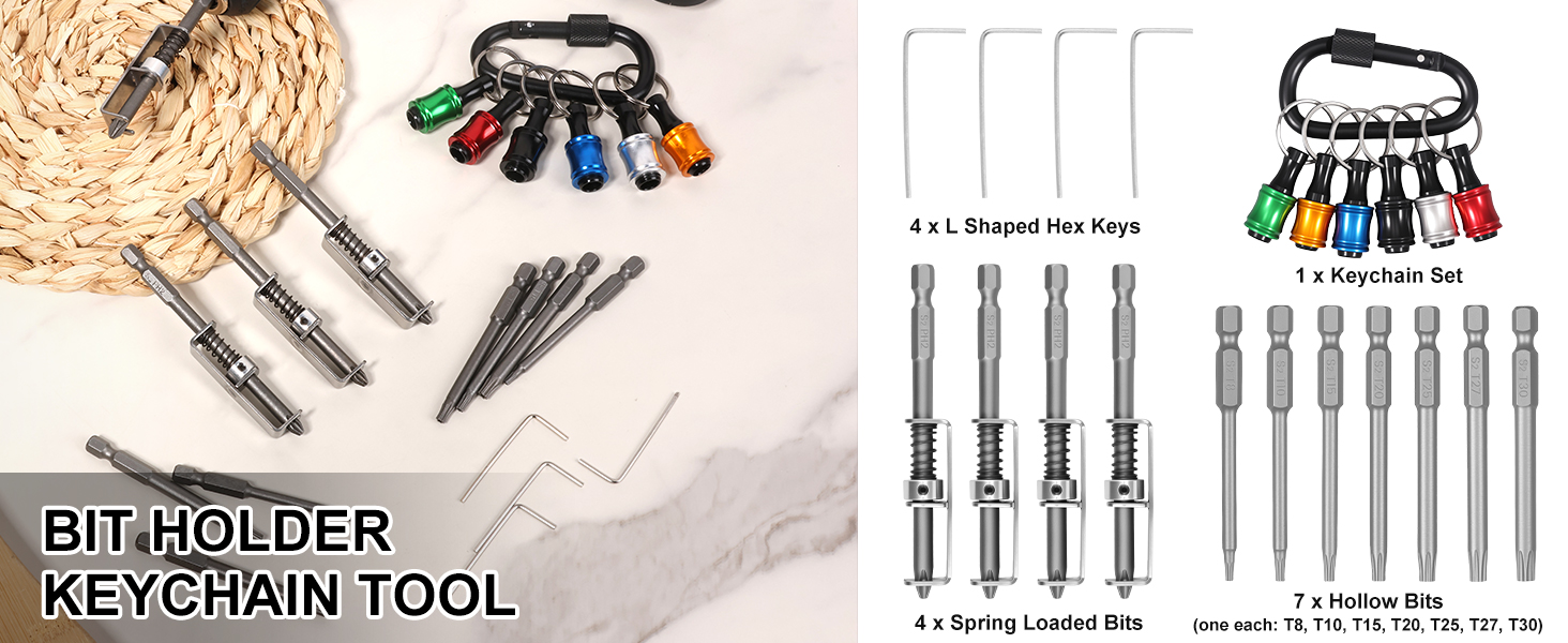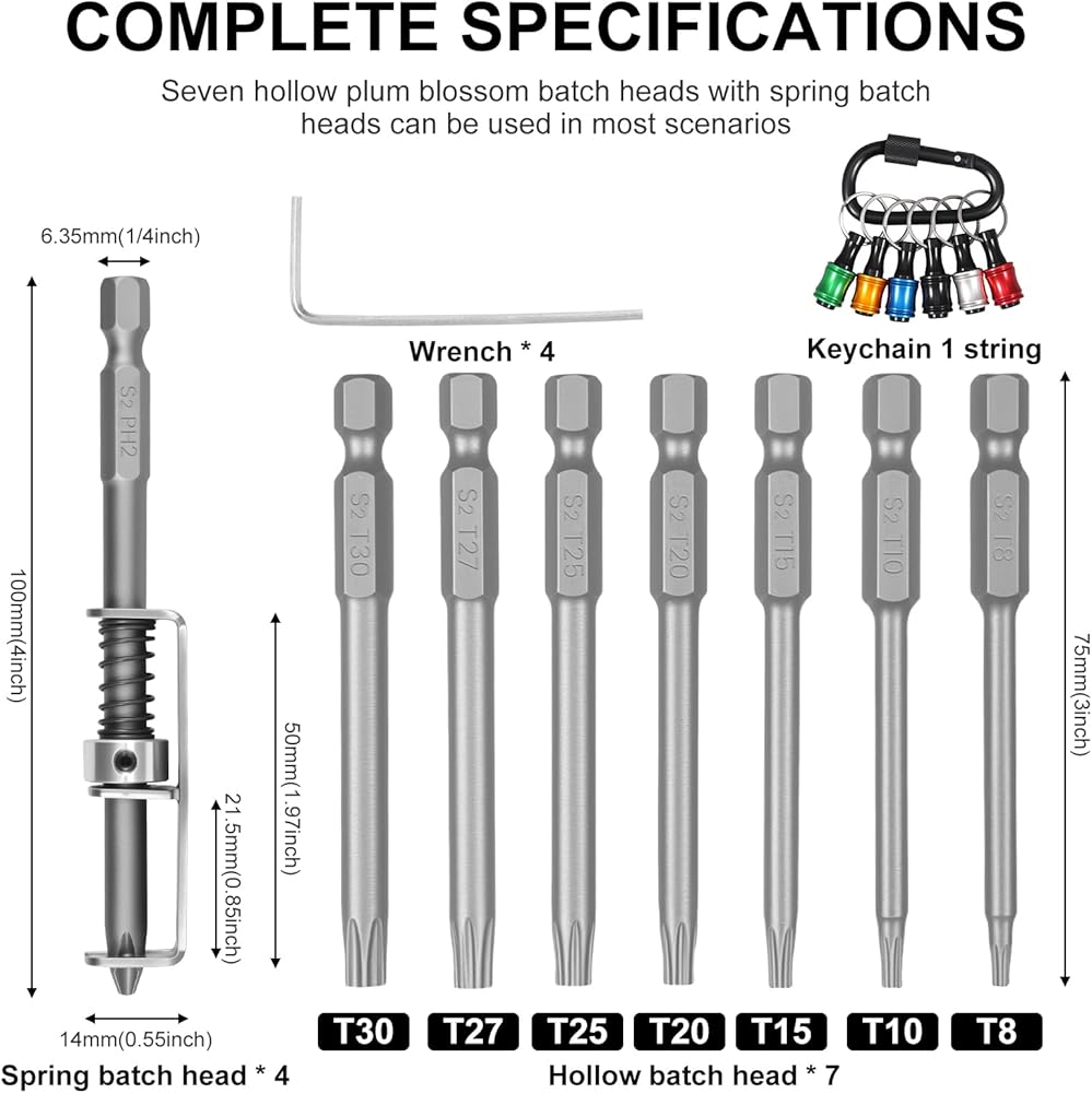 【Complete 11-in-1 Set for Pros & DIYers】:This kit includes 4 spring-loaded screw holding bits (for repetitive fastening) and 7 hollow Torx bits (T8-T30). Ideal for electricians, carpenters, HVAC techs, and home DIYers. One set handles everything from outlet covers to deck screws and automotive trim.