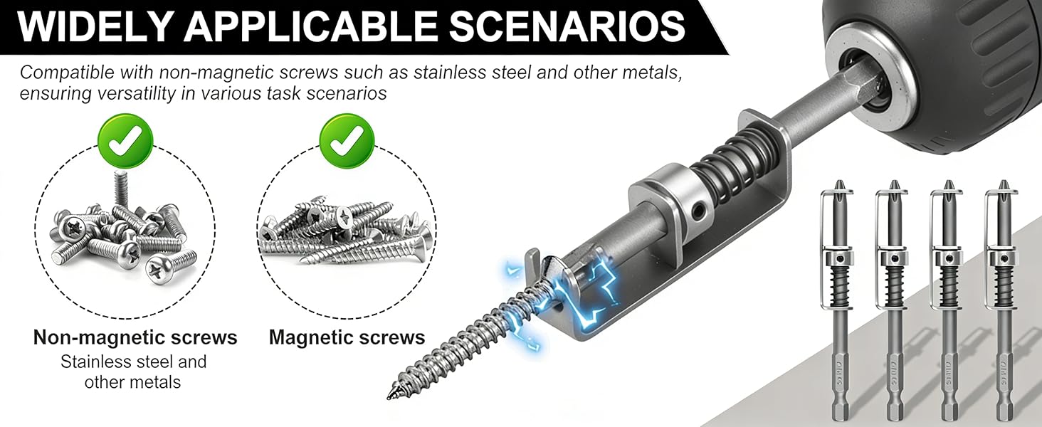 【No More Dropped Screws – Magnetic-Free Design】:Tired of screws falling off magnetic bits? This spring-loaded screw holder grips non-magnetic screws (stainless steel, brass, aluminum) securely by the shank. The precision spring clip holds tight—no wobble, no drops, even on critical installations.