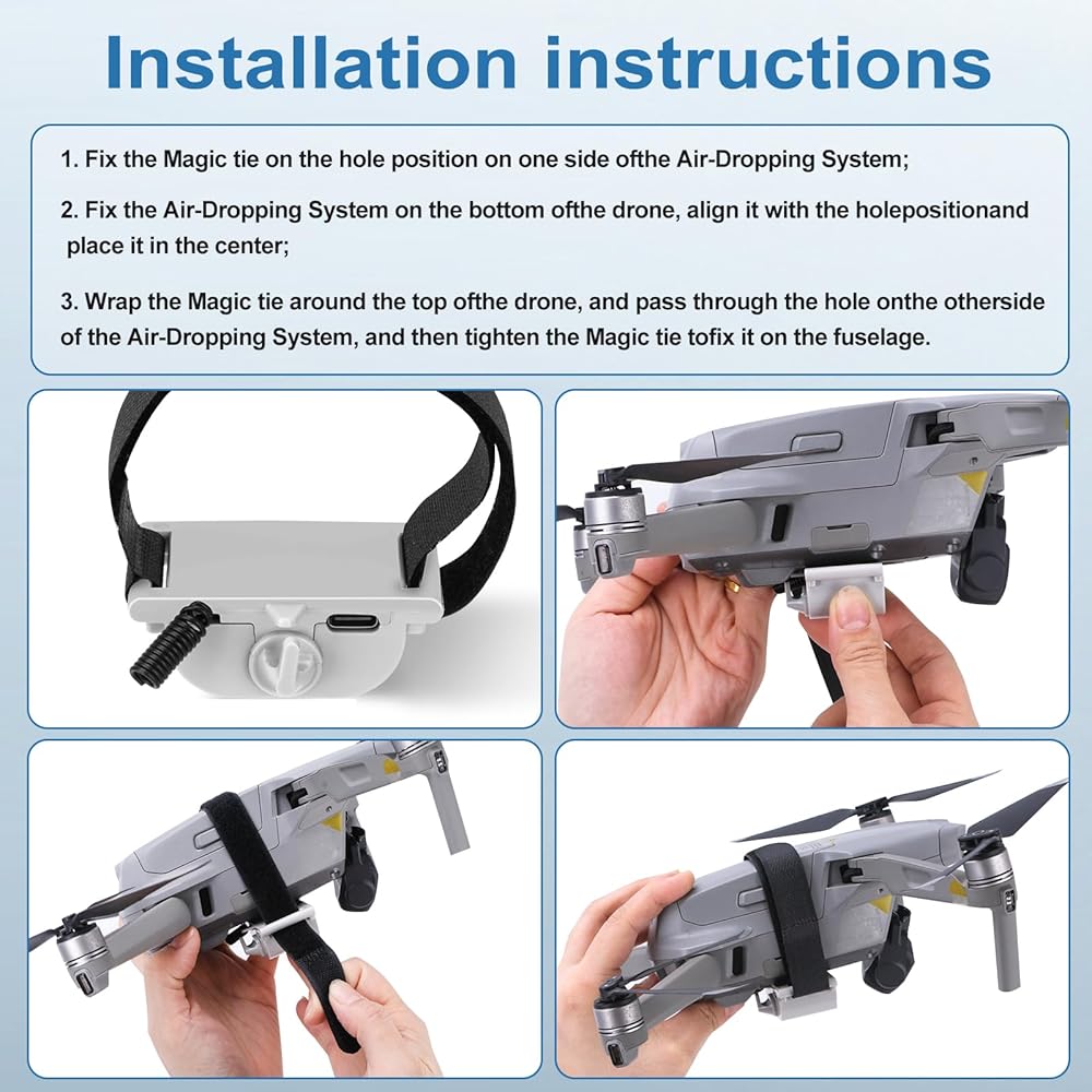 【The airdrop device Easy installation】 The strap is fixed on the device, and the device is aligned with the bottom hole of the drone and fixed. The strap goes around the top of the drone and goes through the device hole, then it is tightened and fixed.