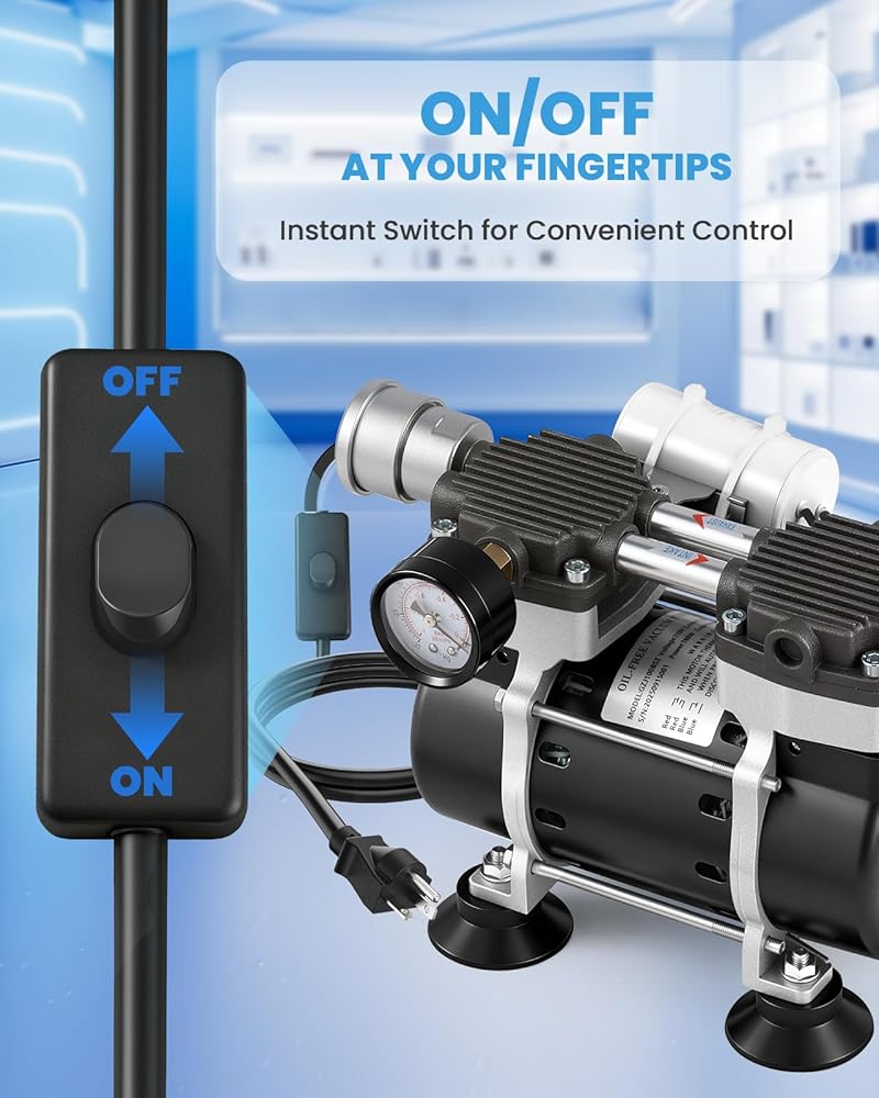 Easy to Operate: The upgraded version comes with a convenient power switch—no need to frequently plug and unplug the cable. Simply attach the muffler to the outlet and the adapter to the inlet, then power on for instant operation. The built-in vacuum gauge allows quick and accurate vacuum readings.