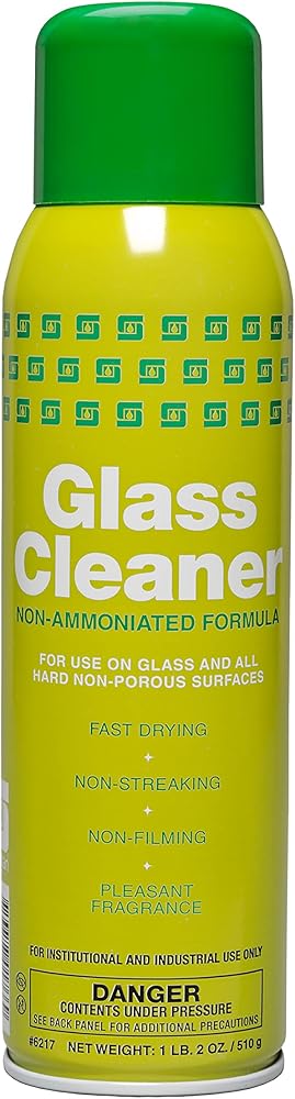 Non-ammoniated. For glass and hard non-porous surfaces. Quickly emulsifies and suspends surface soils and smoke film for easy removal without streaking. 20 oz. cans; Net 18 oz. pH 8.5 - 9.0. Glass cleaning formula for industrial, institutional, and commercial use.