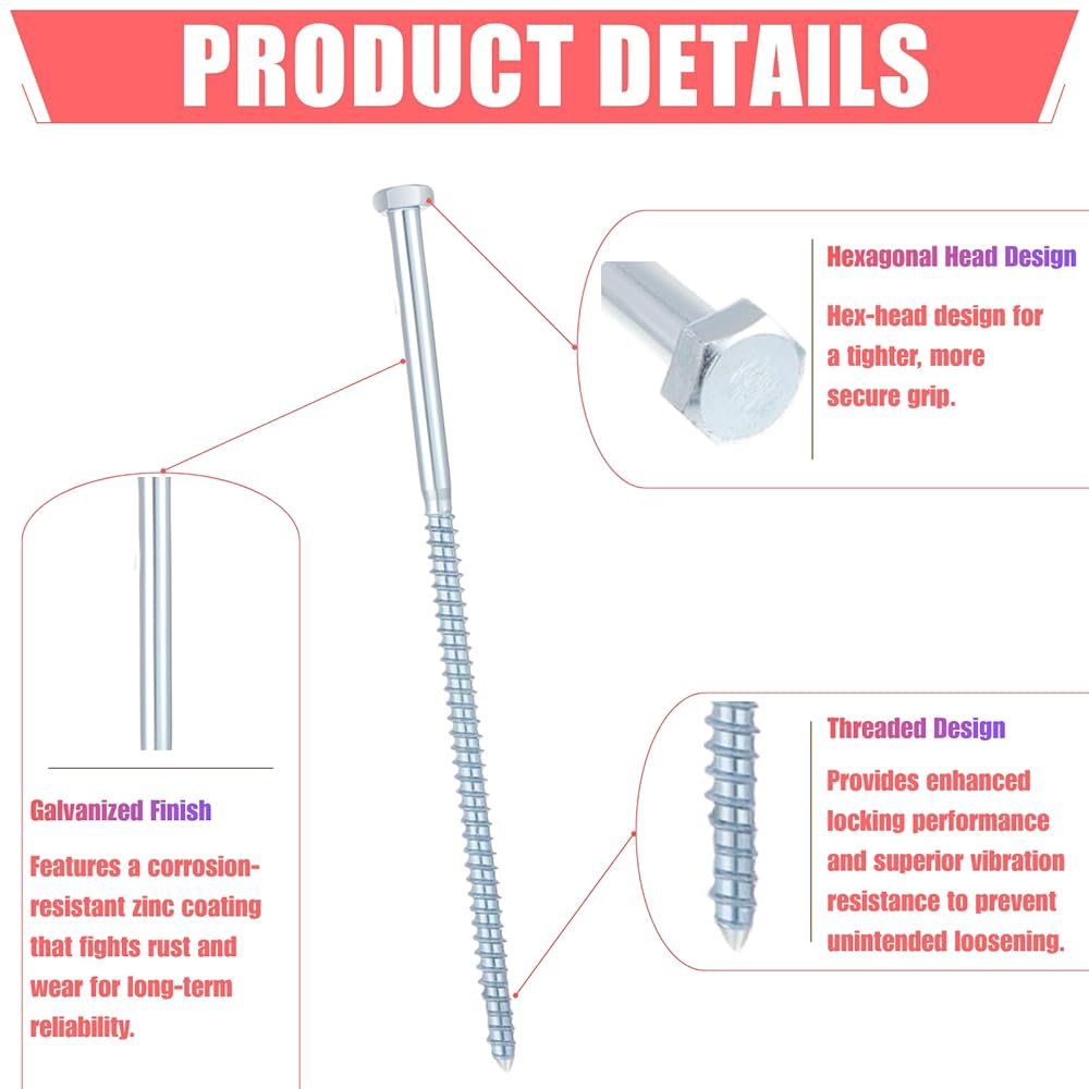 Superior Corrosion Resistance: Protected by a high-quality galvanized finish, these lag bolts are built to resist rust and withstand harsh outdoor elements. Ideal for decks, fences, and playsets that are exposed to rain and moisture.