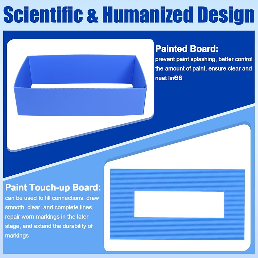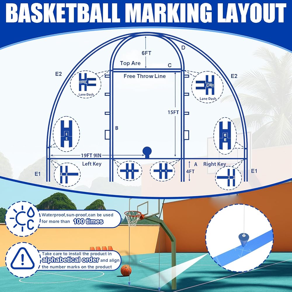 γPremium PC Material γThis Heavy-Duty Basketball Court Stencil Kit is made of thicked 0.08-inch PC plastic, featuring a waterproof and non-slip texture that prevents shifting during use. The Basketball Court Marking Kit ensures smoother, more precise lines and can be reused over 100 times without cracking or warping