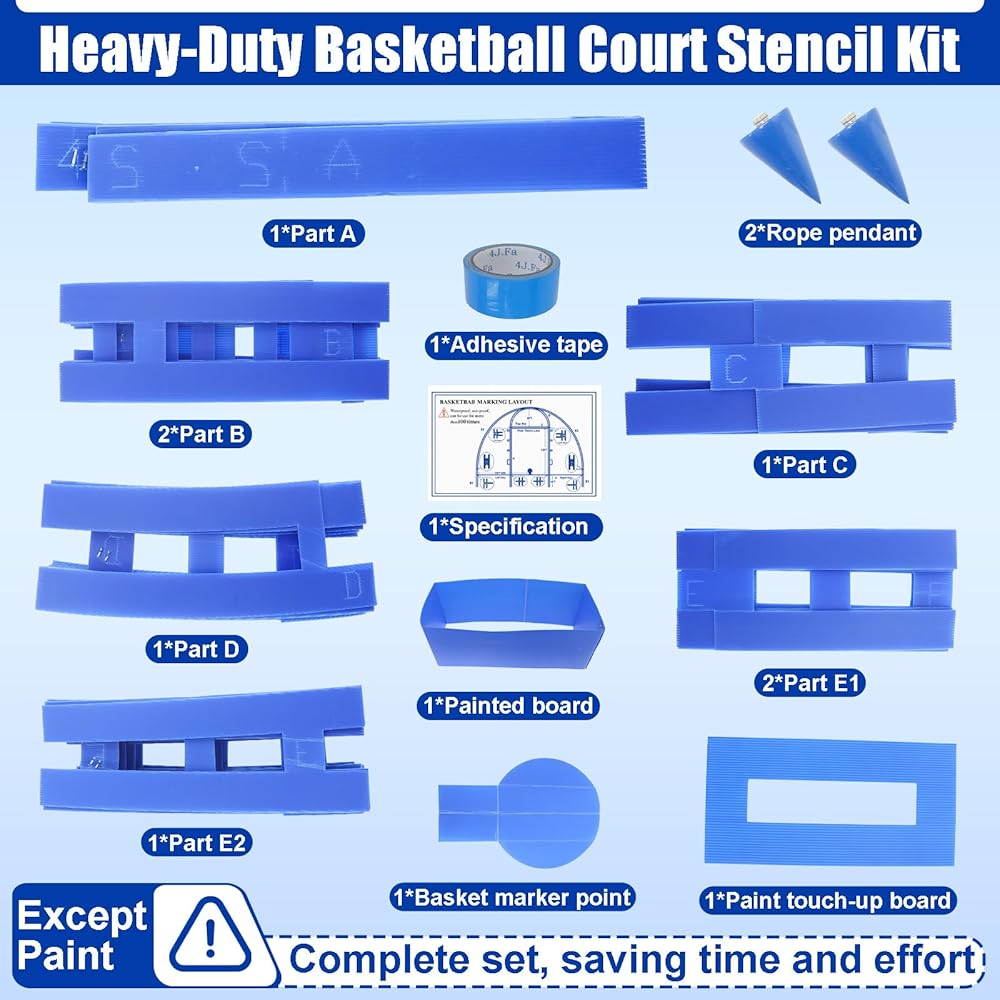 γComplete KitγThe Basketball Court Painting Stencil Kit includes 5 pre-marked templates, 1 paint board, 1 repair board, 2 plumb bobs, 1 heavy-duty tape roll, and 1 detailed instruction manual β everything you need to create a basketball court from start to finish