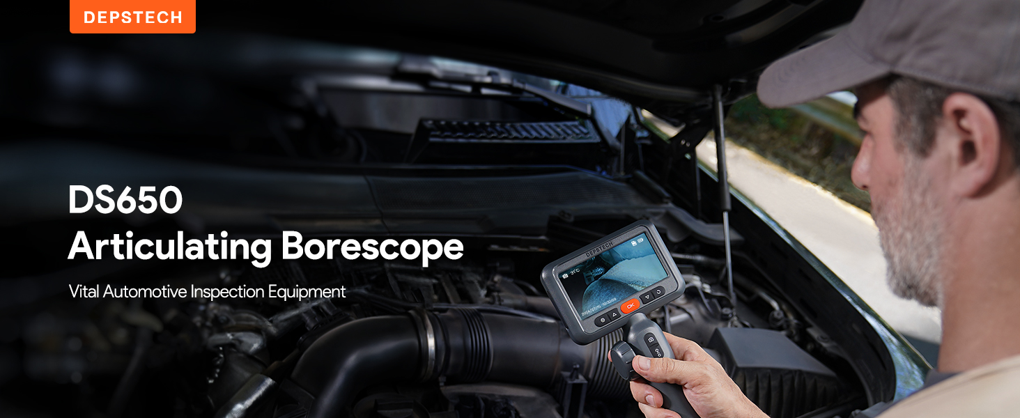 【Smart Guidance & Ergonomic Design】Designed for both experts and beginners, the DS650 articulating borescope features intuitive step-by-step guidance. Its ultra-slim 0.33" probe accesses tight spaces effortlessly, while the ergonomic joystick grip ensures comfort and precision during extended use