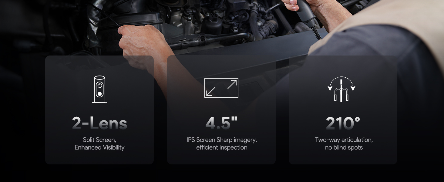 【Effortless Tight-Space Navigation】Tired of inaccessible areas complicating your inspections? The DS650 articulating borescope with dual lens 210° bidirectional articulation glides through confined areas with precision. Dual 78° FOV lenses with split-screen provide expansive visibility, while the side-mounted control wheel ensures smooth one-handed operation. Engineered for complex, hard-to-reach inspections