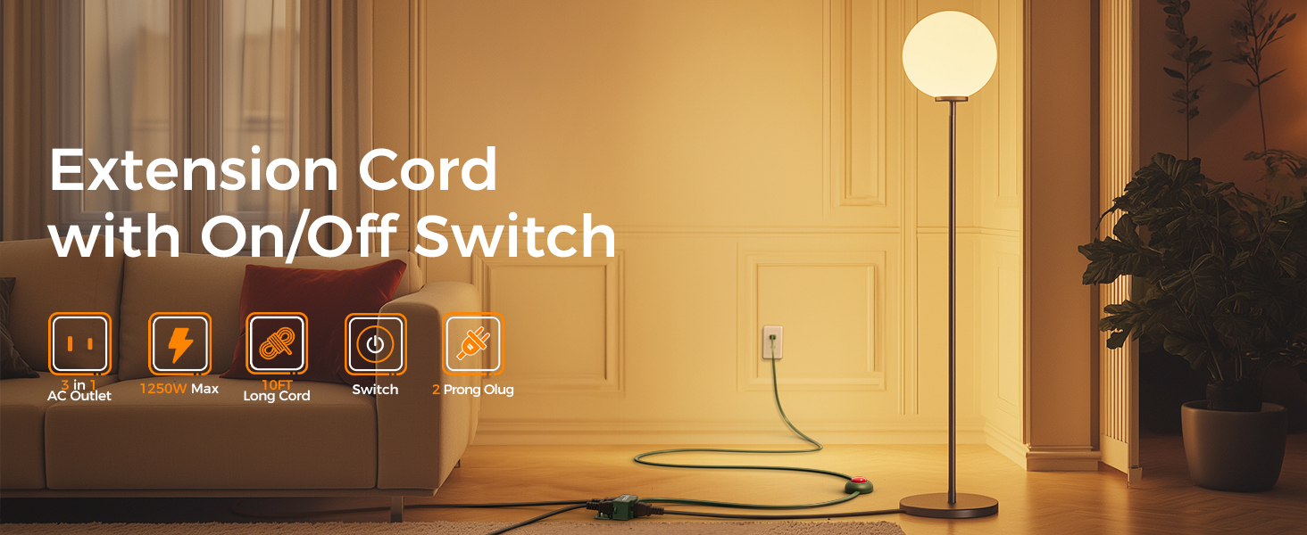 Foot Switch Extension Cord: The lamp switch allows you to easily turn the power on or off without bending down; This foot switch outlet provide convenient experiences in daily life