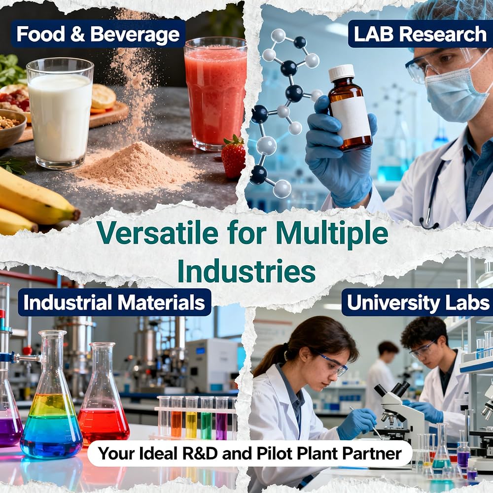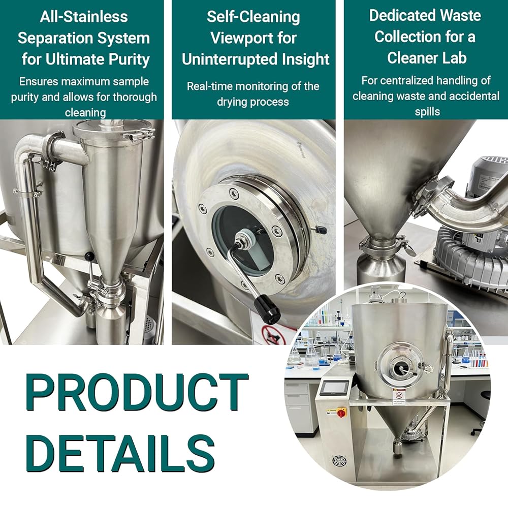 Food & Lab Grade Safety: All contact parts are crafted from high-quality stainless steel, ensuring food-grade safety and sample purity. It's the ideal spray drying machine for demanding applications in milk, coffee, and lab powder production