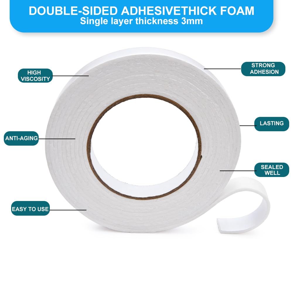 Double Sided Foam Tape:The width of the white foam tape is 1.18 inch, the thickness is 0.12inch, total length is 33ft/10m. Strong Double Sided foam Mounting Tape that is rated to hold 5 pounds of mass per square inch of double-sided tape, making it ideal for mounting large and heavy tools, pictures, vinyl, greenhouse tarp, teaching materials, posters and picture frames.