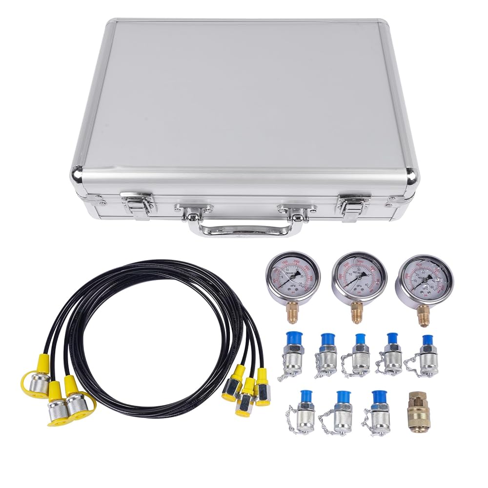 【All In One Convenience Design】: This hydraulic test kit includes 3 test hoses, 9 test couplings, 3 hydraulic gauges and 1 portable case with compact packaging to save storage space and improve portability