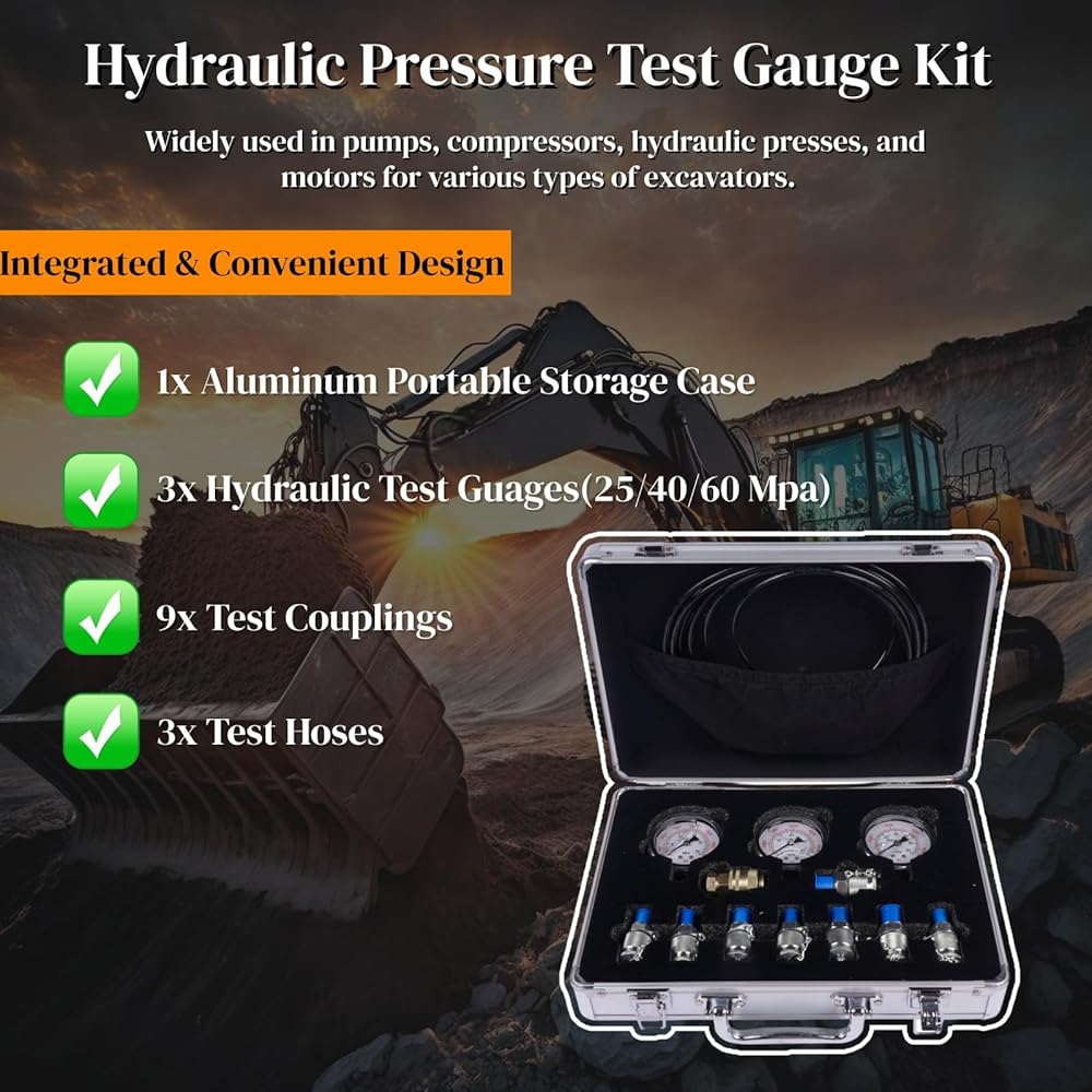 【Accurate Pressure Measurement】: Our hydraulic pressure test kit Features three 60mm gauges with dual scale units in Mpa and PSI(0-25 MPa/0-4000 PSI, 0-40 MPa/0-6000 PSI, 0-60 MPa/0-10000PSI. Silicone oil filling ensures vibration resistance and long term stability