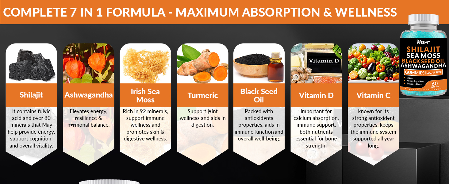 📈 IMPROVES ENERGY LEVELS: 7-in-1 formula shilajit Sea Moss Black Seed Oil gummies offer a higher concentration of fulvic minerals to boost your energy levels, enhance your immune system,support overall vitality and digestion, also improved skin and hair wellness, helping you power through your day with renewed energy and strength.
