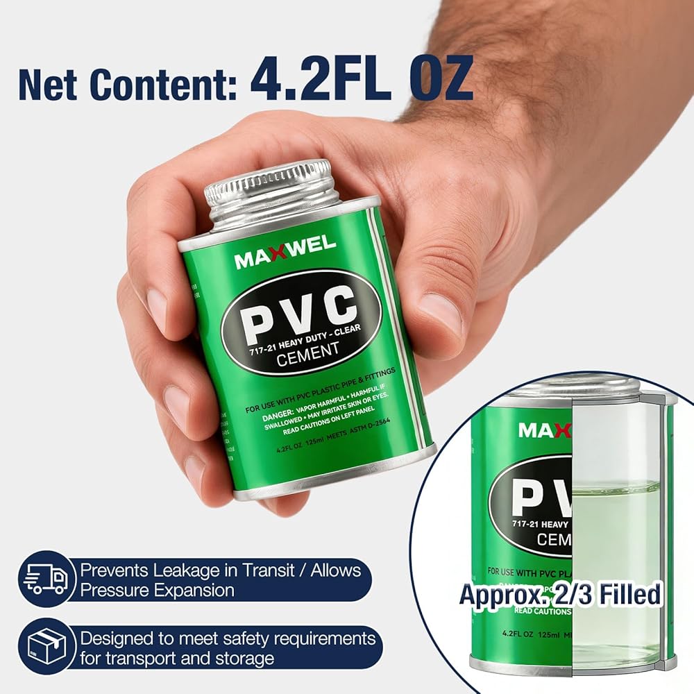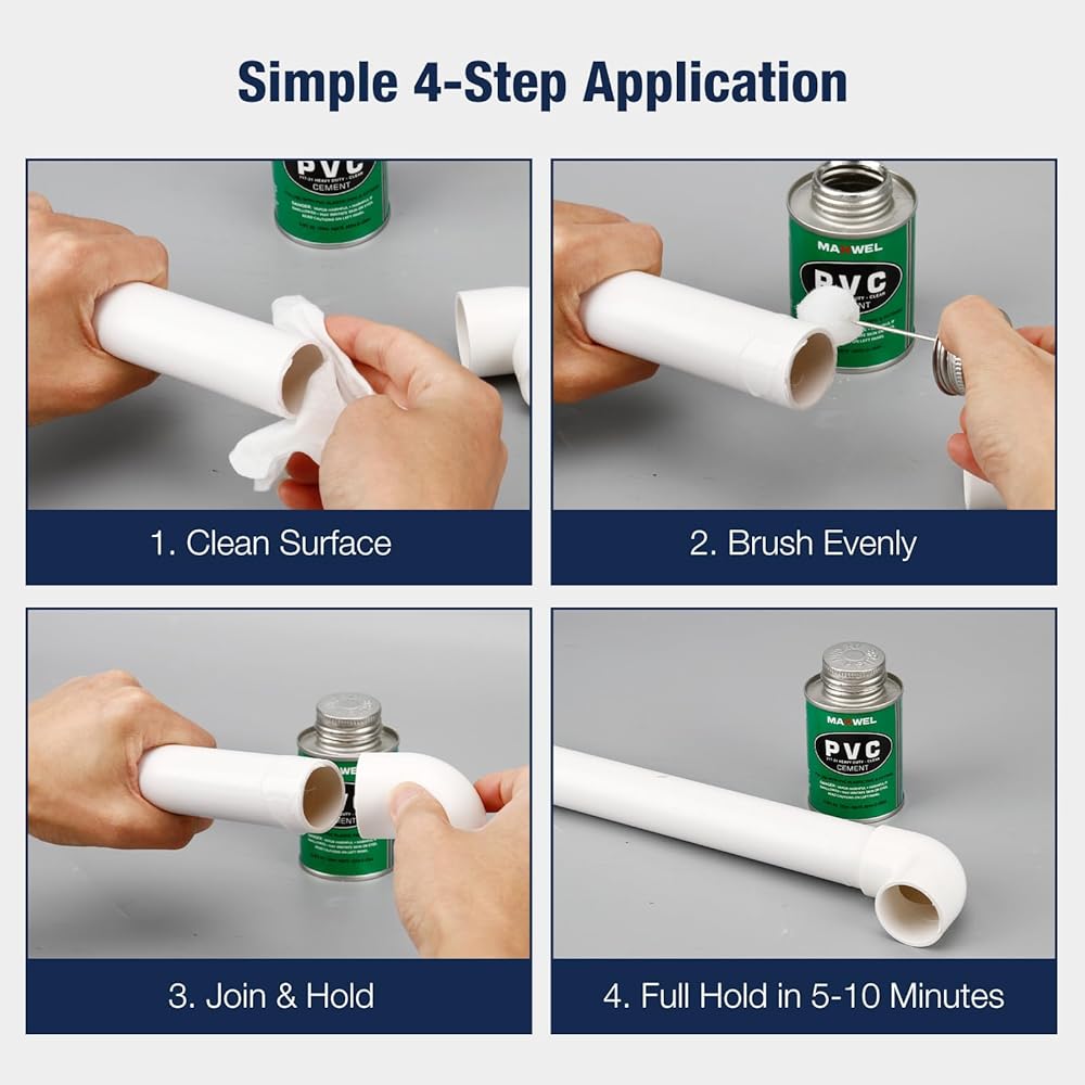 Clean Clear Finish PVC Pipe Glue: Dries crystal‑clear with no residue or discoloration; built‑in dauber allows precise, mess‑free application;