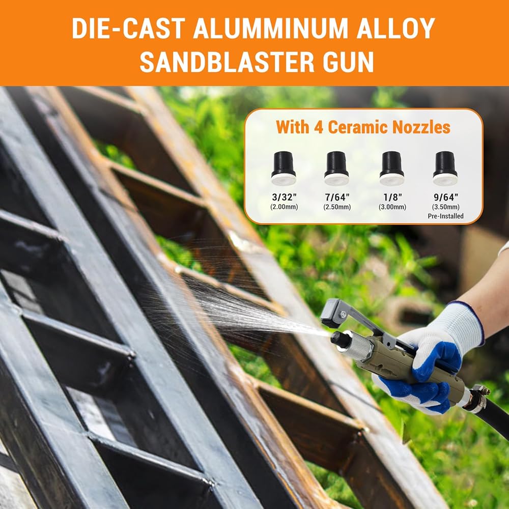- Lightweight, flexible aluminum sandblasting gun provides precise one-hand control and long-lasting performance.